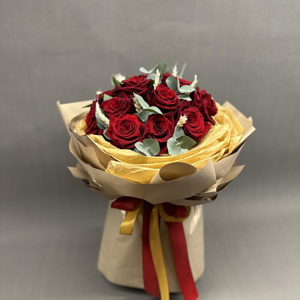 Red rose - 15 pcs Eucaliptus - 3 pcs millet - 3 pcs