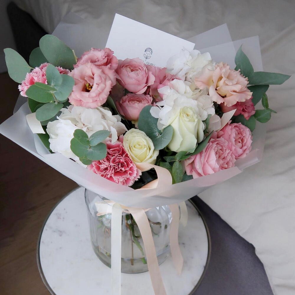 Eustoma - 2 pcs Eucalyptus - 2 pcs Spray rose - 2 pcs Hydrangea - 1 pcs rose - 2 pcs dianthus - 2 pcs