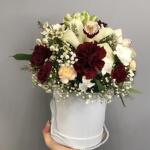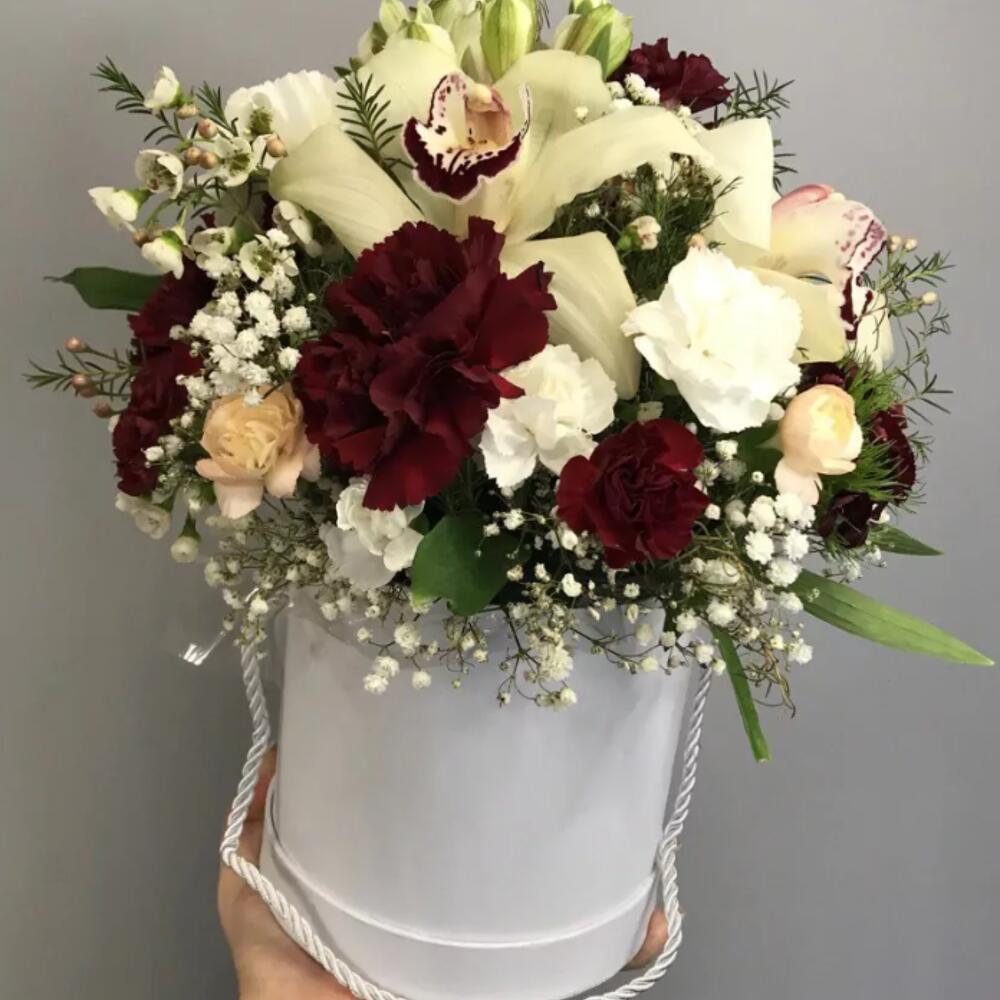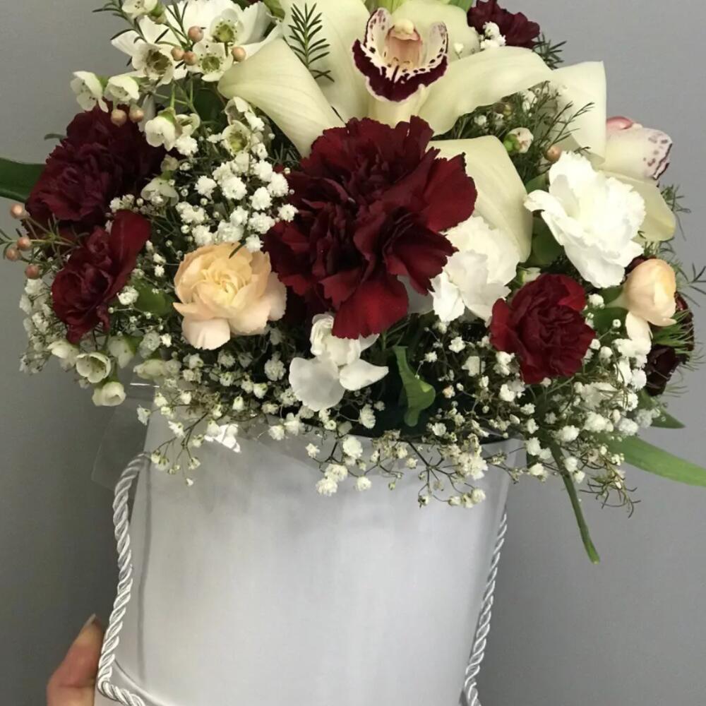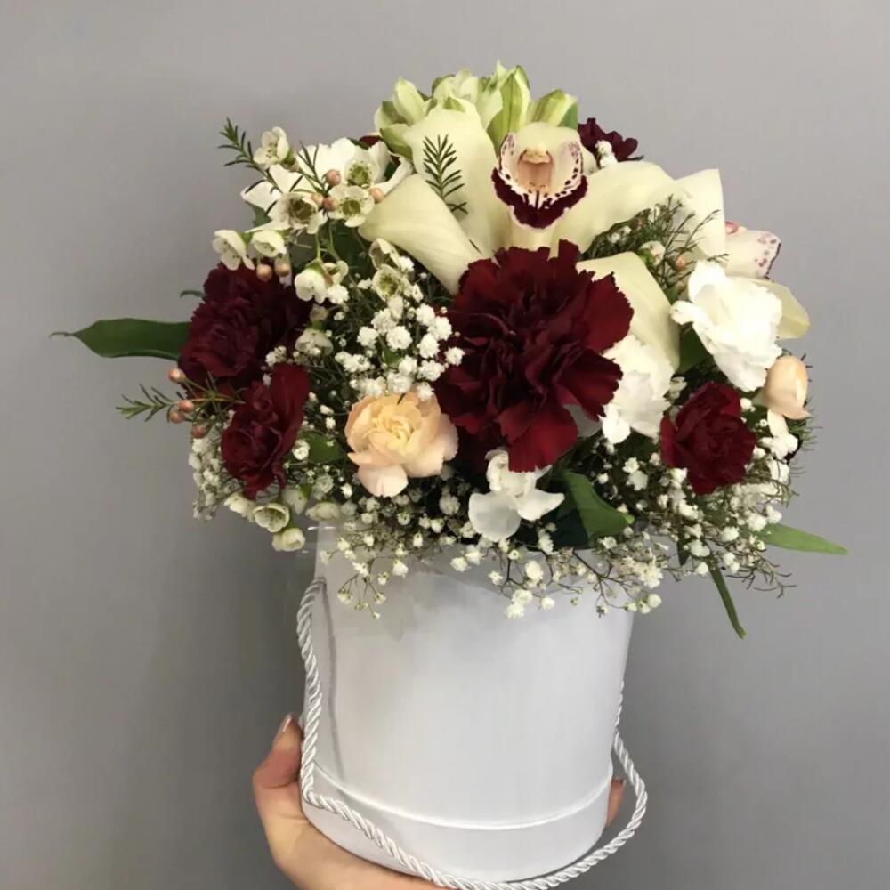 Flowers in a box made using a special floral sponge. A nice, modern flower box will be a good gift for any occasion. There is an option to add a personalized note with a dedication for the recipient. Composition: orchids, carnations, alstroemerias, baby's breath, green additions. (17-19 flowers)