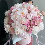 Arrangement with peonies and phalaenopsis in a box