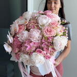 A luxurious box with aromatic peonies and other premium flowers in light shades.