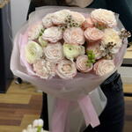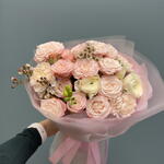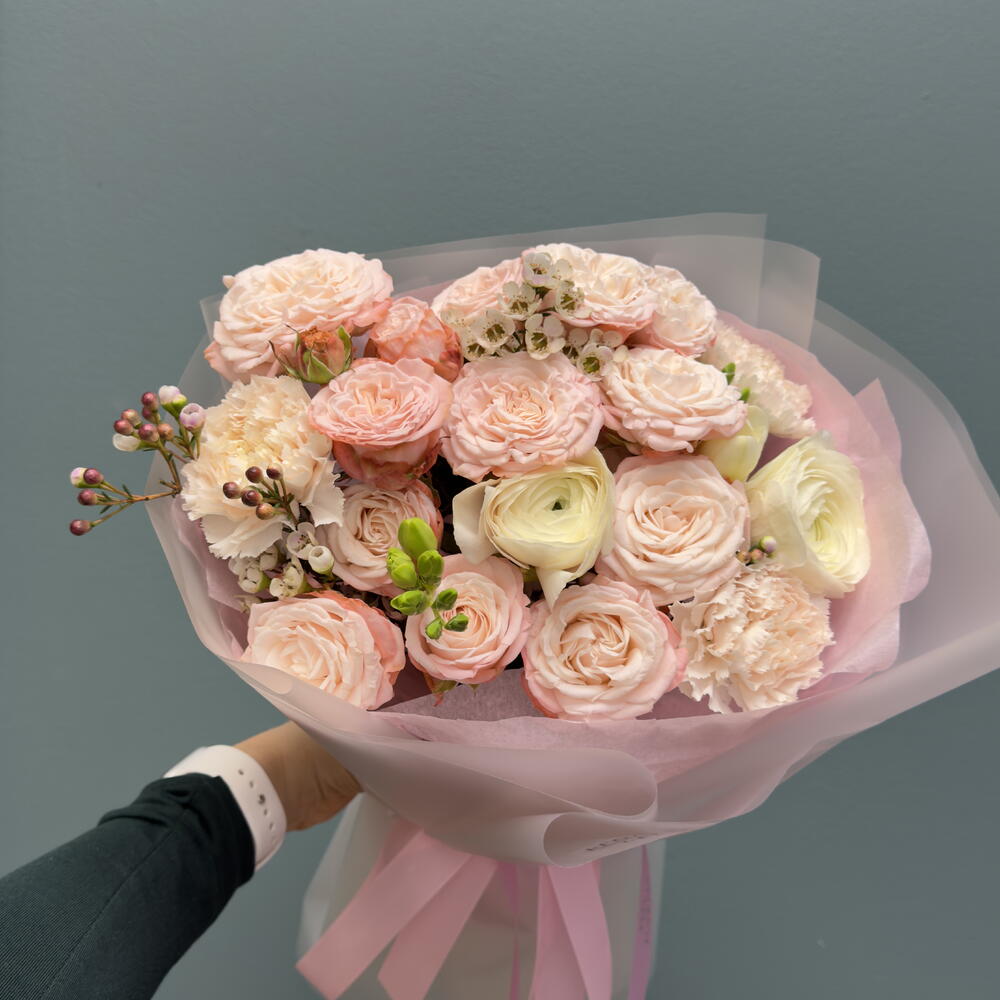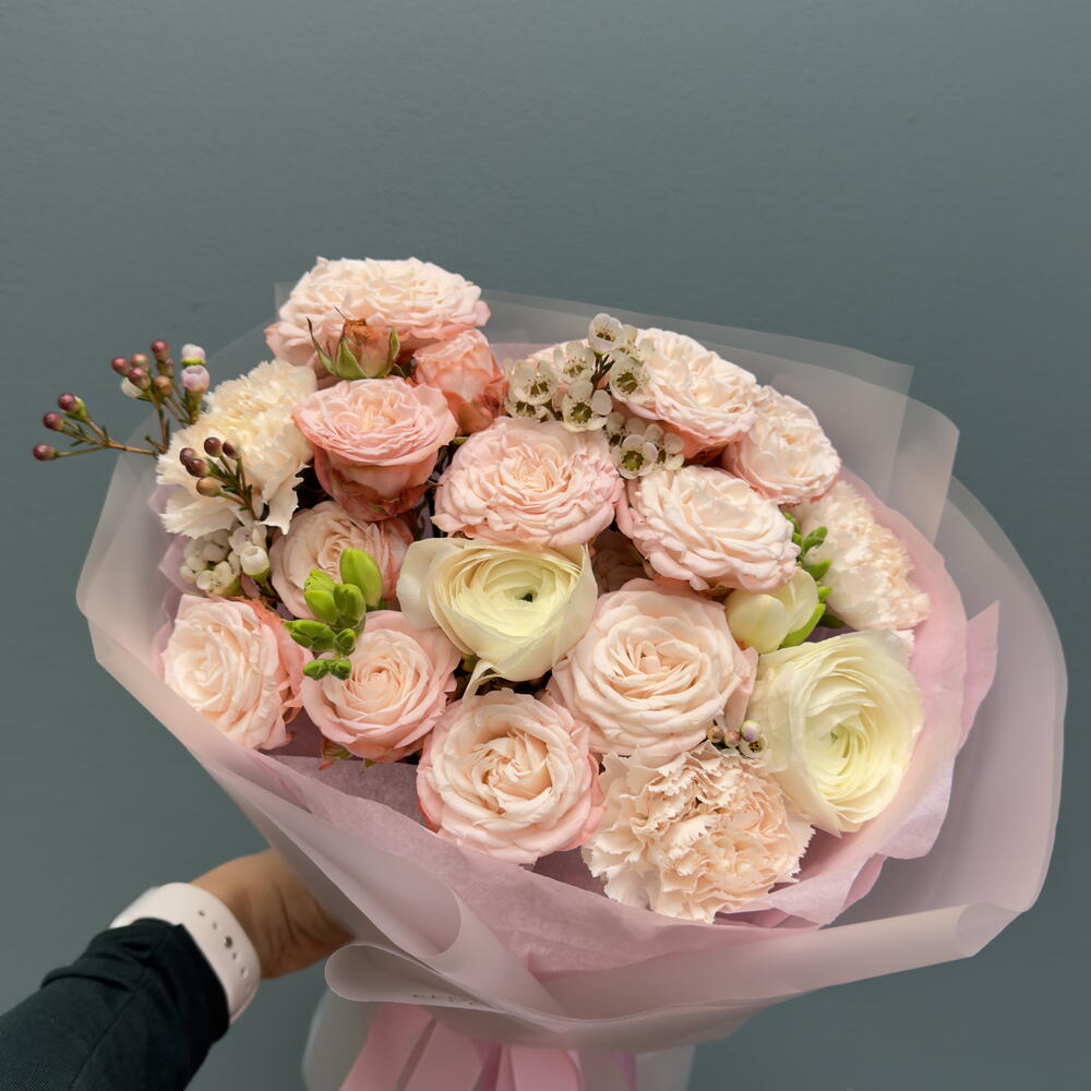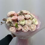 ranunculus - 2 pcs wax - 2 pcs madam bombastic - 3 pcs carnation - 3 pcs freesia - 2 pcs