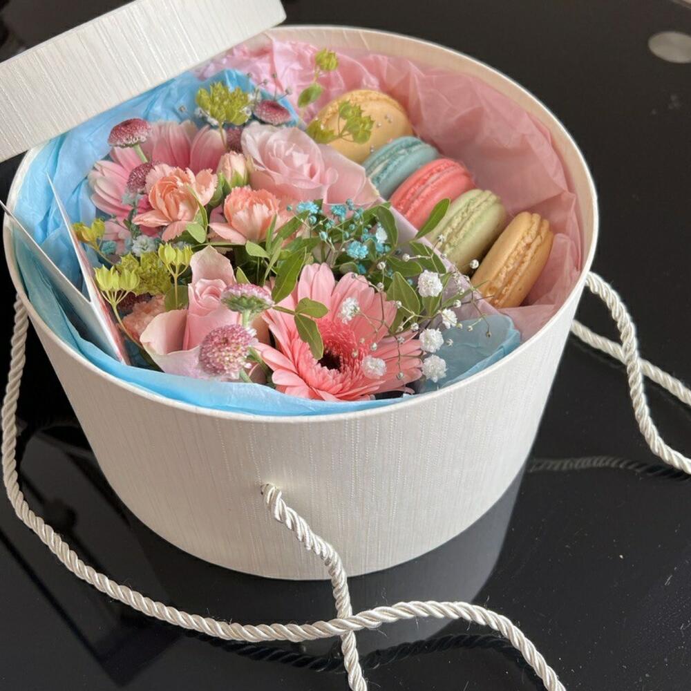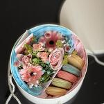 gerbera mini - 2 pcs rose ecuador - 3 pcs decorative greens - 2 pcs gypsophile - 1 pcs macaron (pastry) pistachio - 1 pcs macaroni (pastry) raspberry - 1 pcs blueberry macaroon - 1 pcs strawberry macaroon - 1 pcs mango macaron - 1 pcs