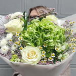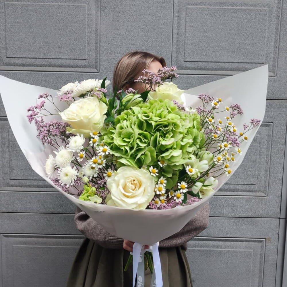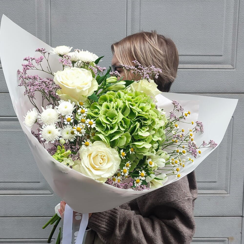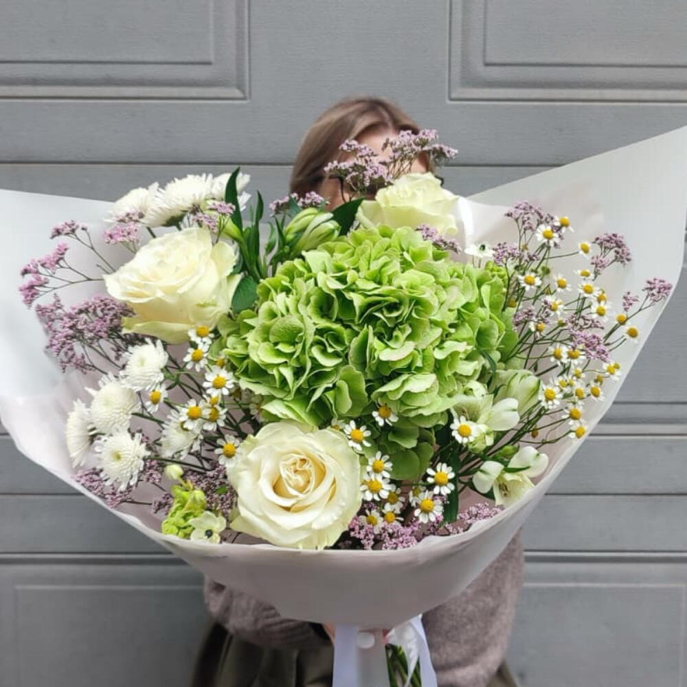 Ornithogalum - 1 pcs Hydrangea - 1 pcs Limonium - 2 pcs Alstroemeria - 3 pcs rose - 3 pcs matricaria - 2 pcs chrysanthemum - 2 pcs