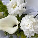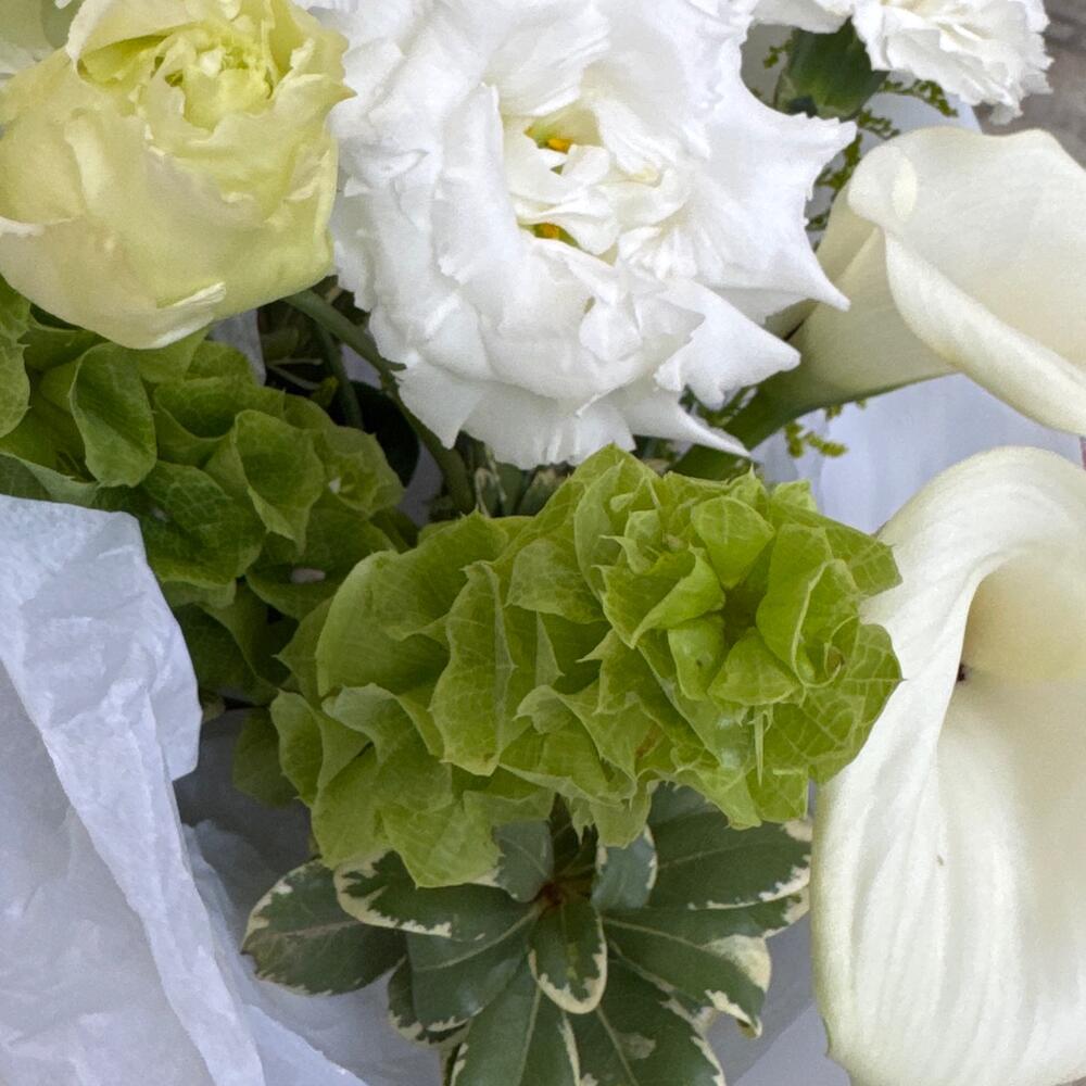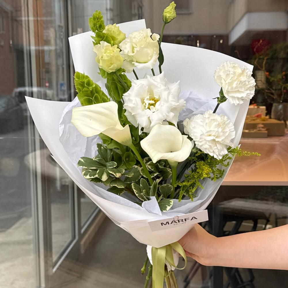 Eustoma - 1 pcs Solidago - 3 pcs calla - 2 pcs dianthus - 3 pcs pittosporum - 1 pcs moluccella - 2 pcs