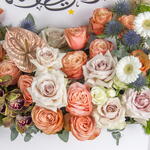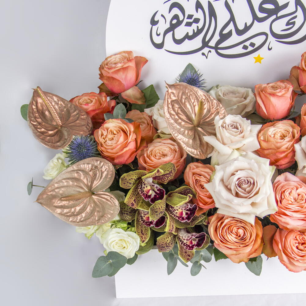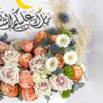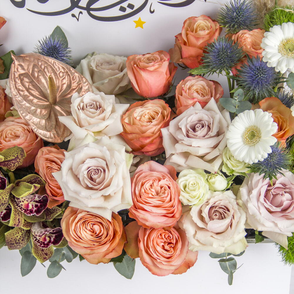 Ramadan Mubarak floral gift box with warm-toned roses and unique accents.