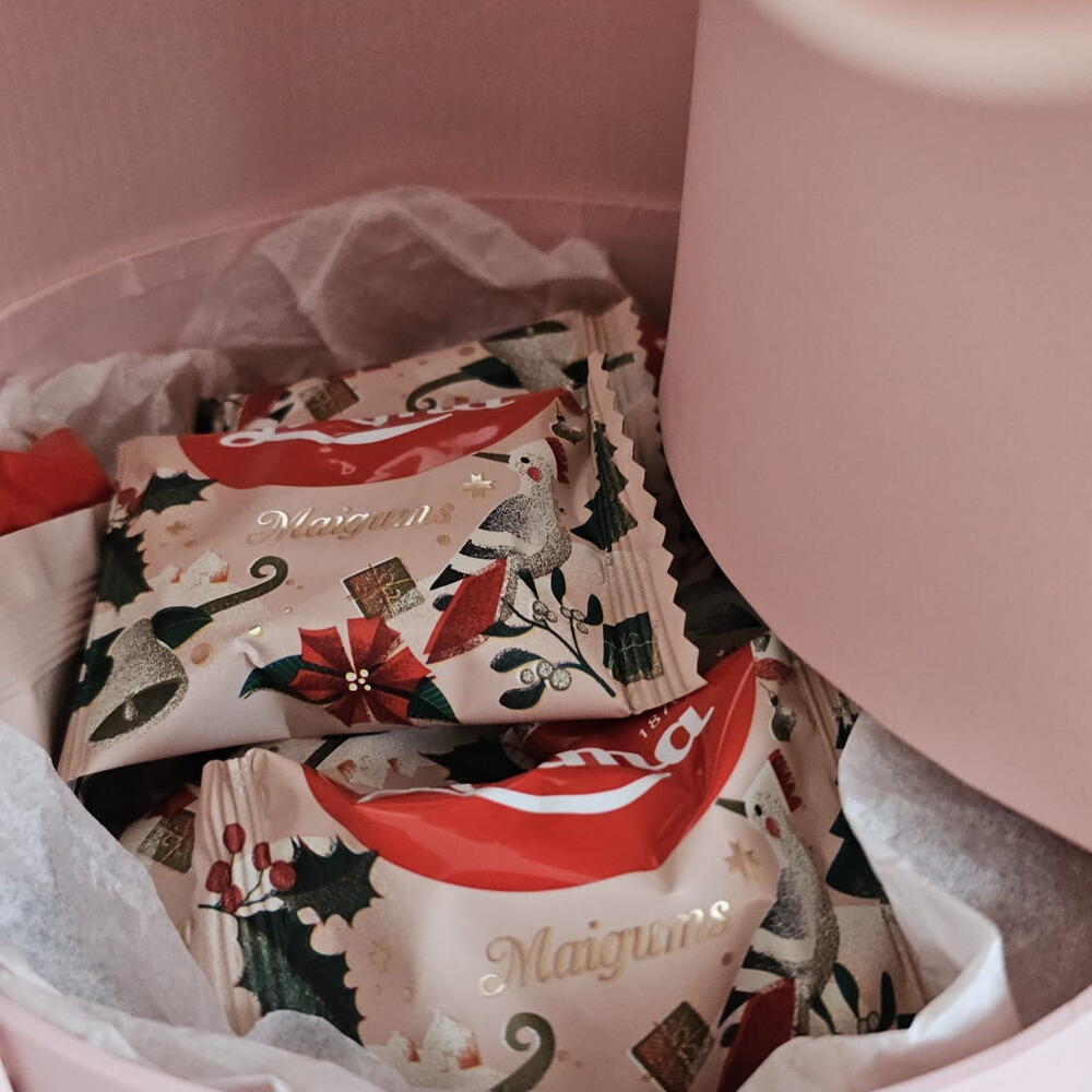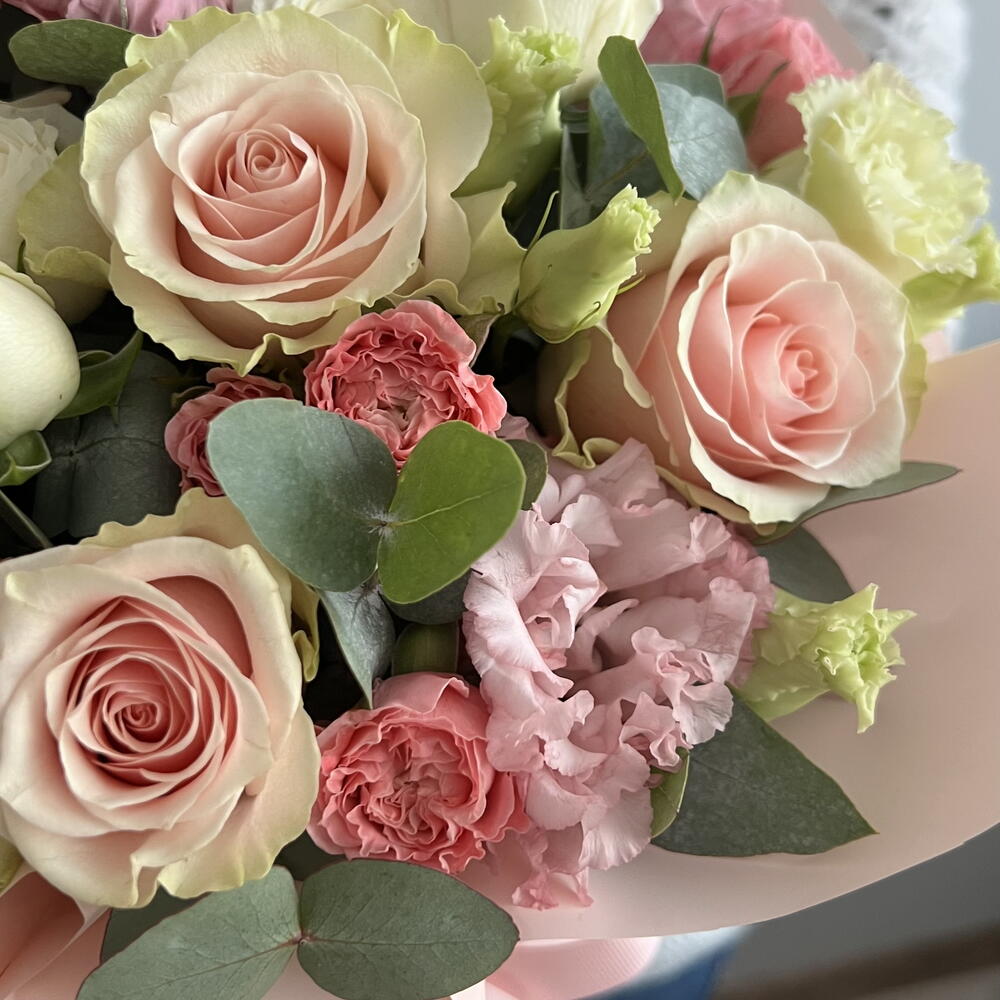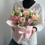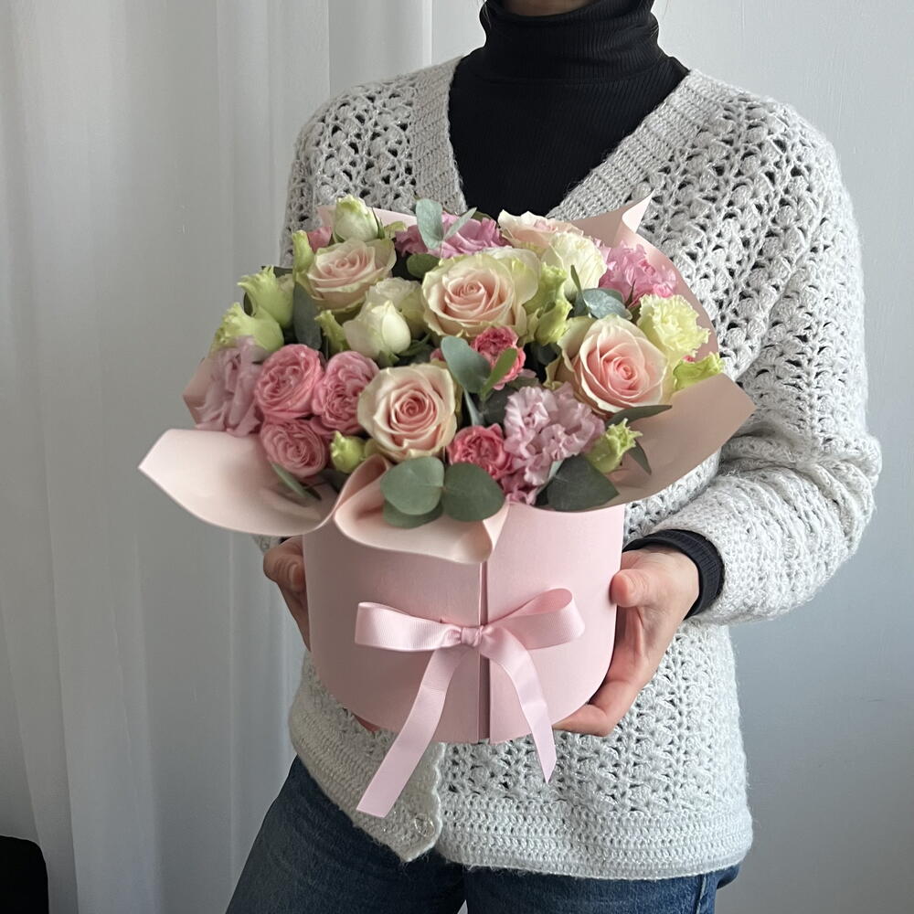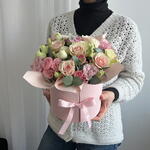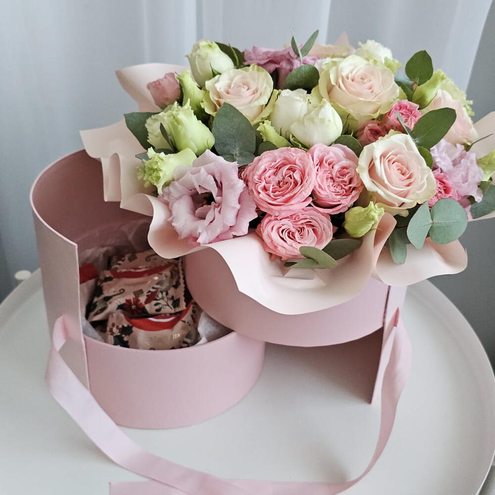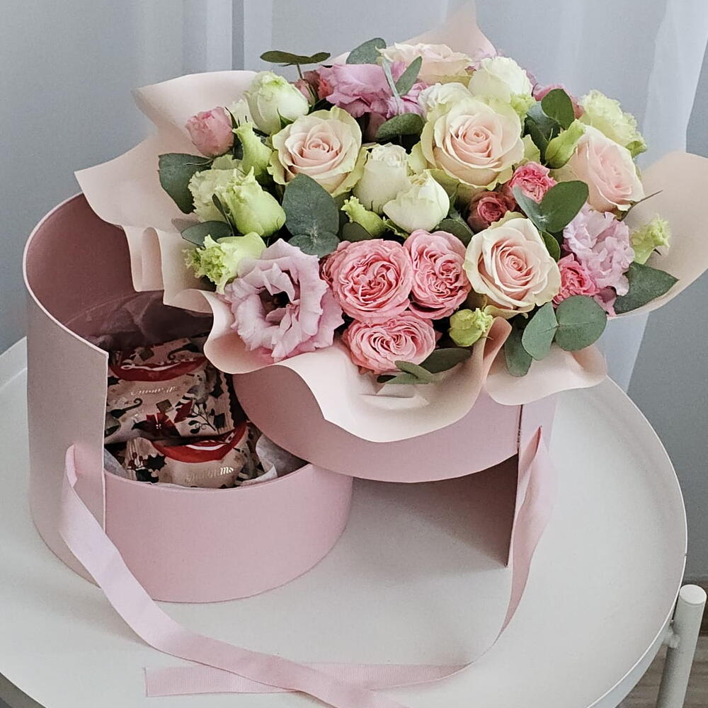 Spray rose - 6 pcs hat box - 1 pcs lizijantus - 3 pcs roses - 5 pcs marshmallow in chocolate - 10 pcs