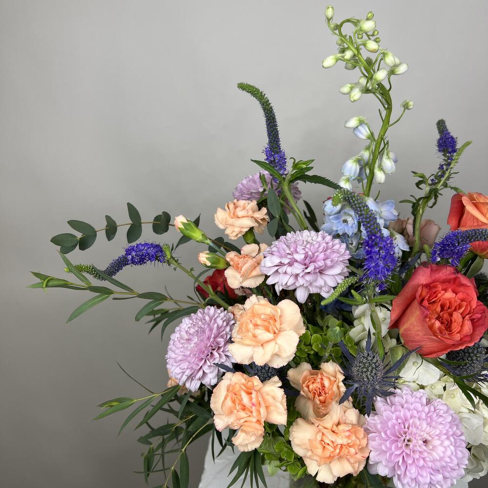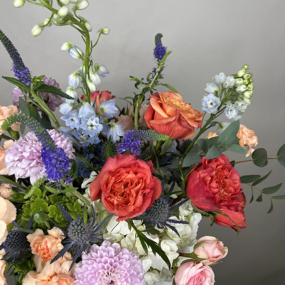 mini carnations - 5 pcs delphinium blue - 2 pcs veronica flower - 7 pcs hydrangea - 4 pcs spray roses - 3 pcs garden roses - 7 pcs mix of greens - 1 pcs