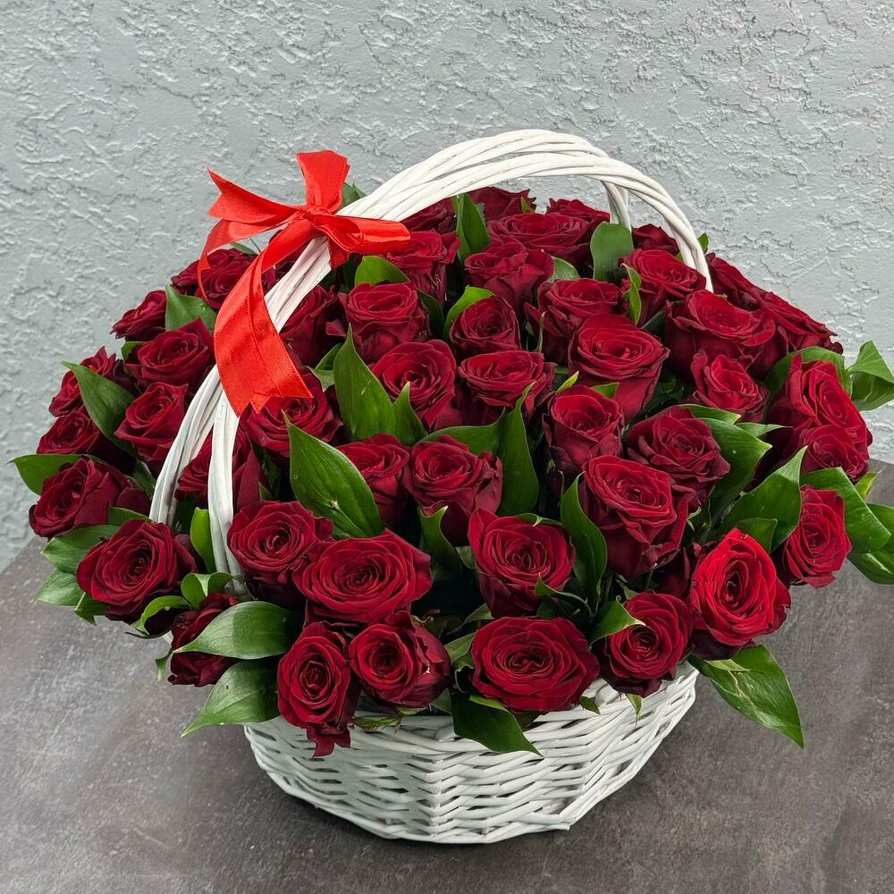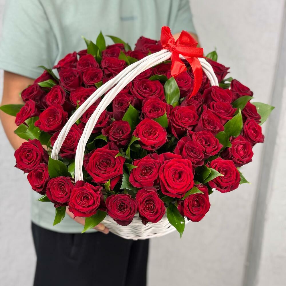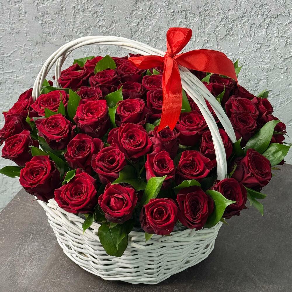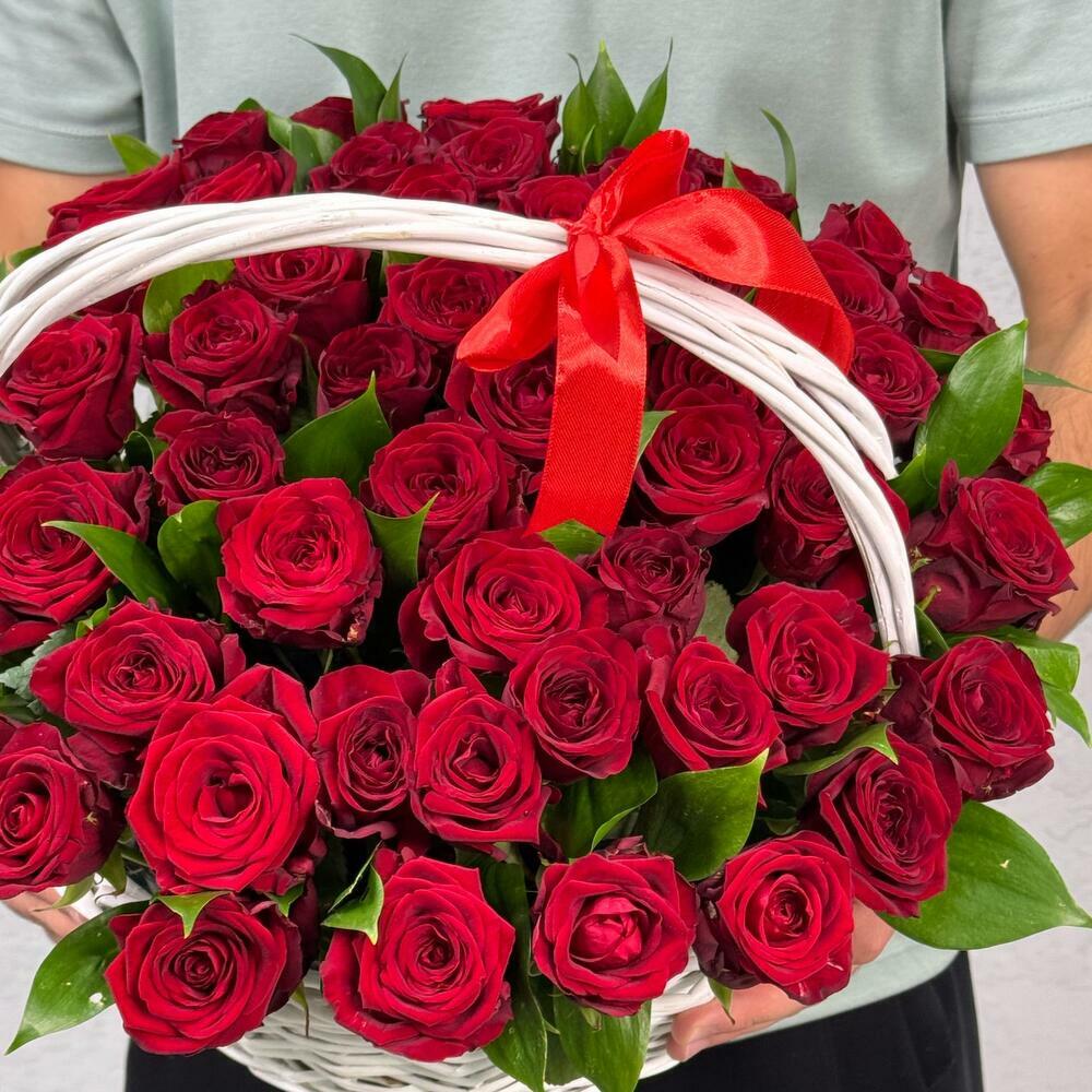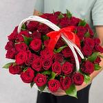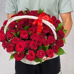 Букет из 55 красной розы в корзине представляет собой изысканную и роскошную композицию. Каждая роза выражает великолепие и нежность, а их общее количество придаёт букету впечатляющий вид.