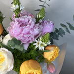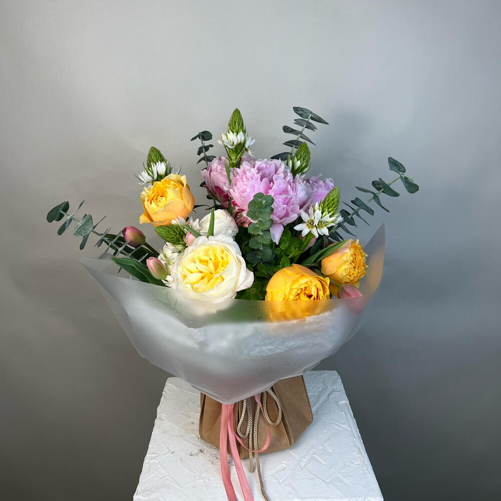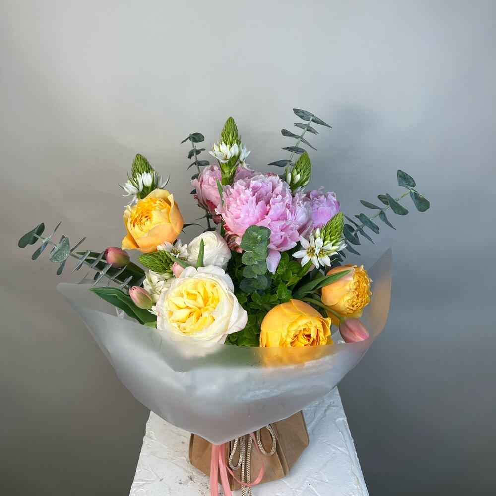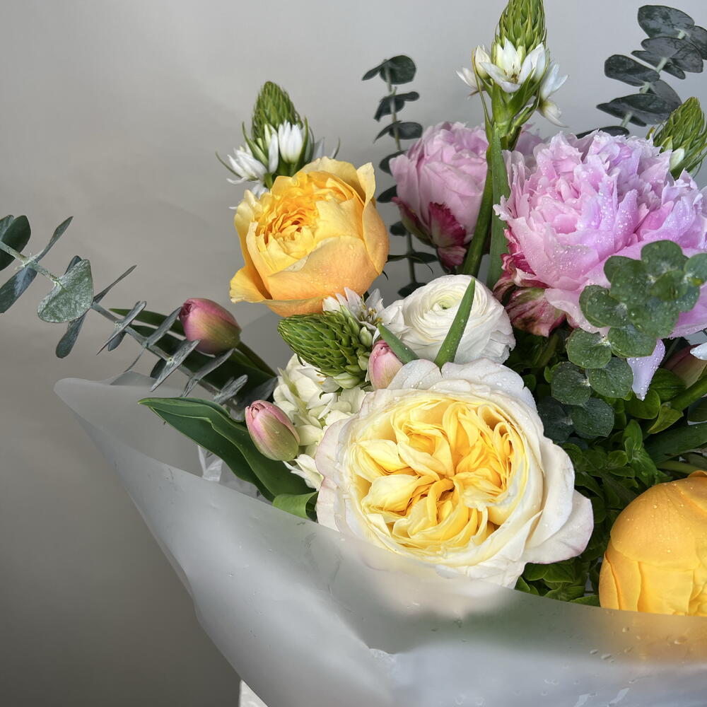 Greenery - 1 pcs Tulips - 7 pcs Peonies - 3 pcs ranunculus - 3 pcs hydrangea - 4 pcs garden roses - 4 pcs star of bethlehem - 5 pcs