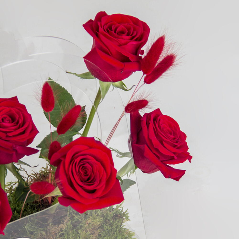 A stunning arrangement of red roses nestled in a heart-shaped acrylic box, creating a truly unforgettable expression of love.