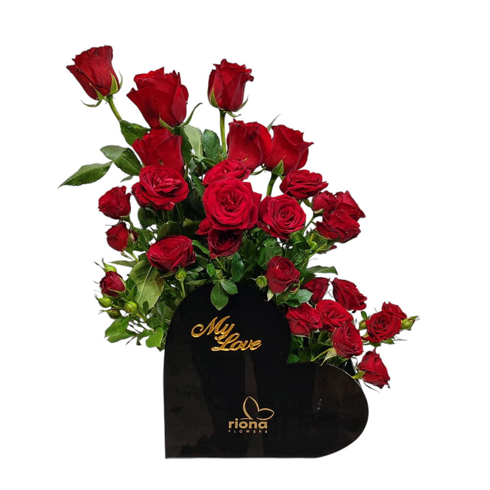 Heart box arranged with red roses and red baby roses