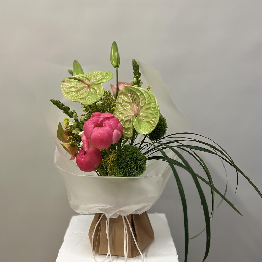 Anthurium - 3 pcs Peonies - 2 pcs oriental lilies - 1 pcs greenery mix - 1 pcs