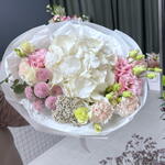 Eucalyptus - 1 pcs Hydrangea - 1 pcs Lisianthus - 1 pcs rose - 1 pcs santini - 1 pcs carnation - 3 pcs spray carnation - 1 pcs ozothamnus - 1 pcs