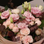 skimmia - 3 pcs lisianthus light pink - 2 pcs spray roses bombastic - 6 pcs eucalyptus painted or natural - 4 pcs