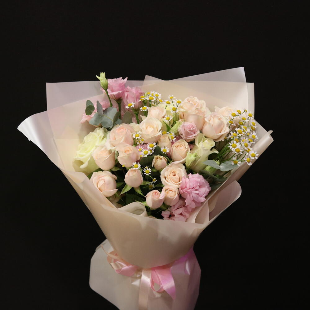 Eucalyptus - 3 pcs Lisianthus - 3 pcs bush daisy - 3 pcs spray roses - 6 pcs ecuadorian roses - 3 pcs