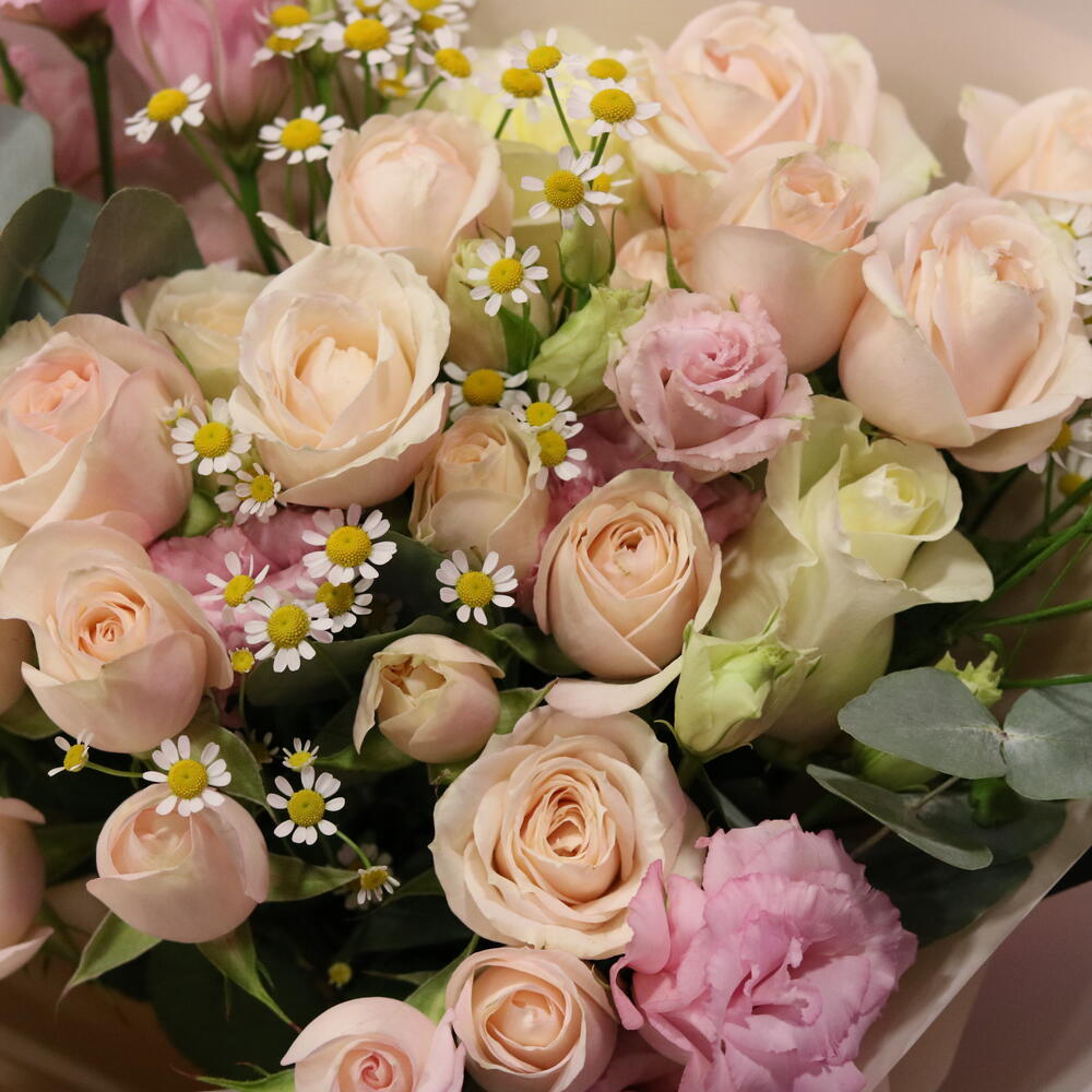 Bouquet with bush roses, lisianthus, bush daisy, Ecuadorian roses and eucalyptus