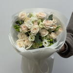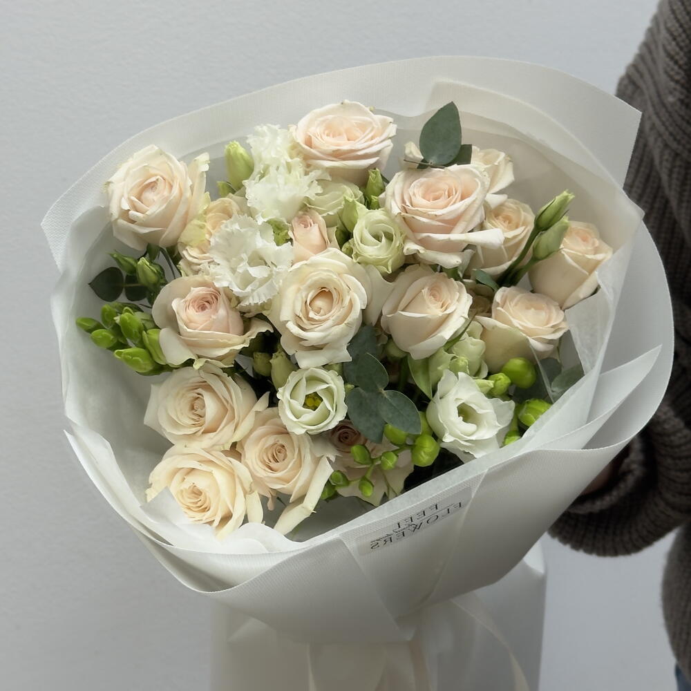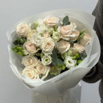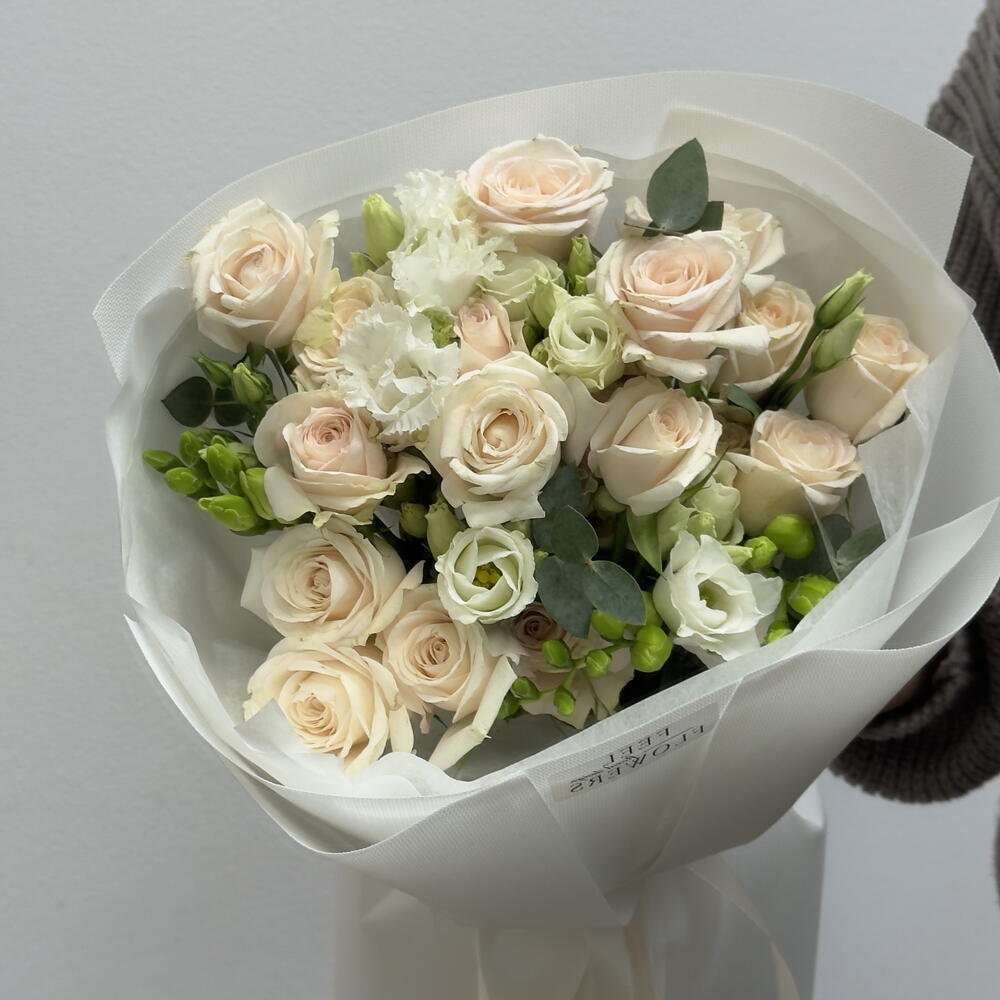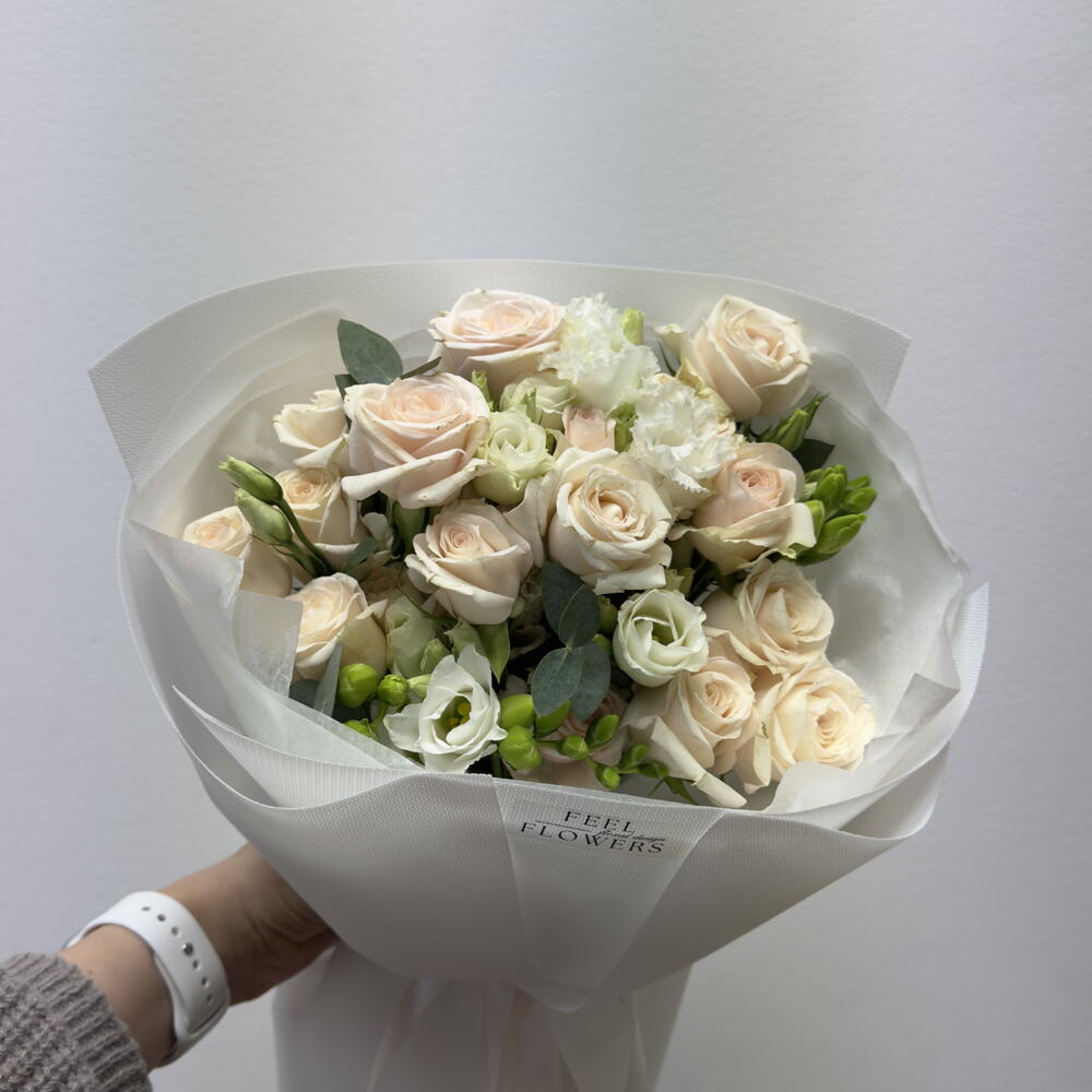 Eustoma - 1 pcs Eucalyptus - 2 pcs spray rose - 5 pcs freesia - 3 pcs