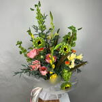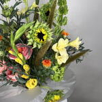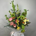 sunflowers - 4 pcs premium garden rose - 7 pcs hydrangea - 1 pcs mix of greens - 3 pcs irish bells - 3 pcs sword lilies - 6 pcs