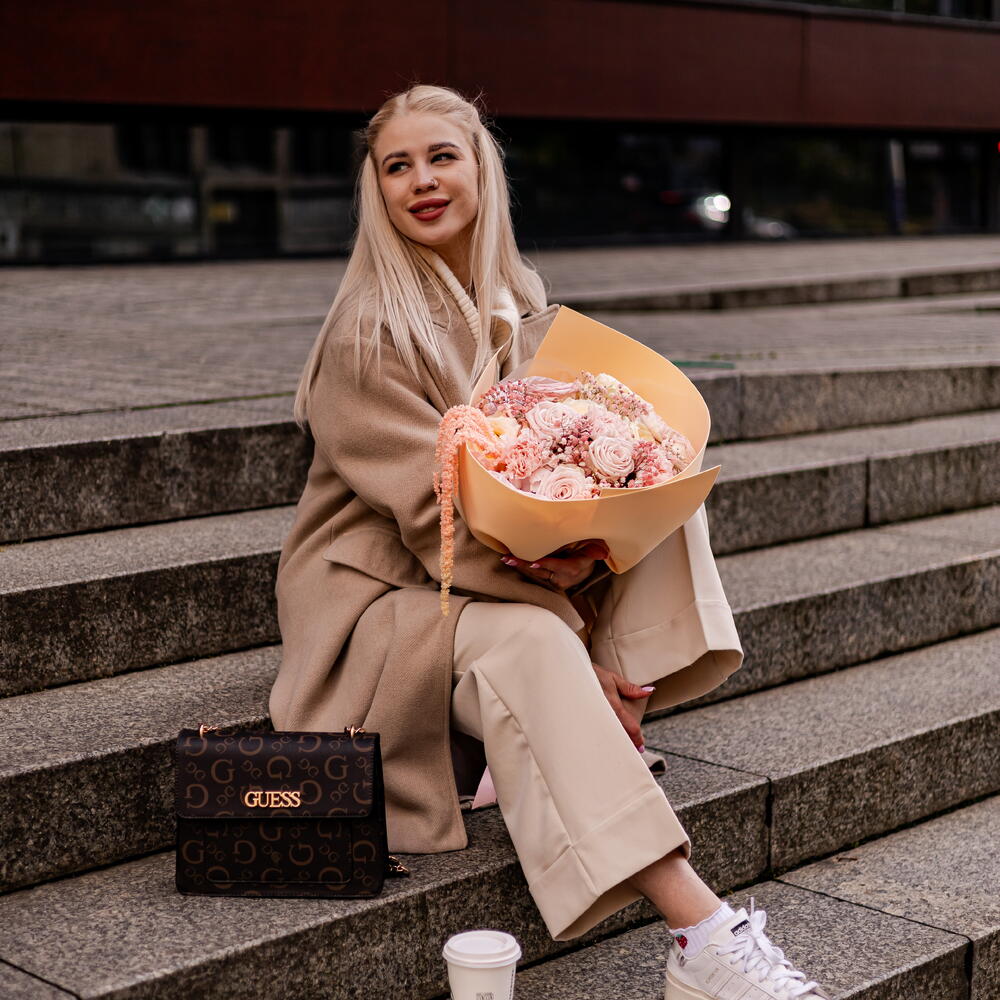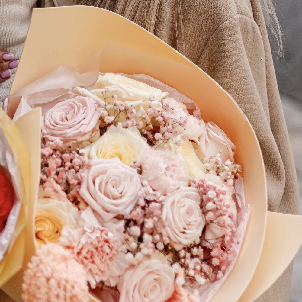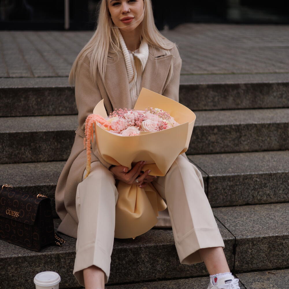 Romantic bouquet in delicate, powder-pink shades, created with subtle emotions and elegance in mind. A soft color palette, a light form and carefully selected flowers make the composition exude calm and femininity. An ideal gift for a birthday, an anniversary or as a beautiful gesture with no occasion.