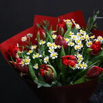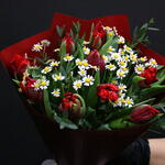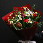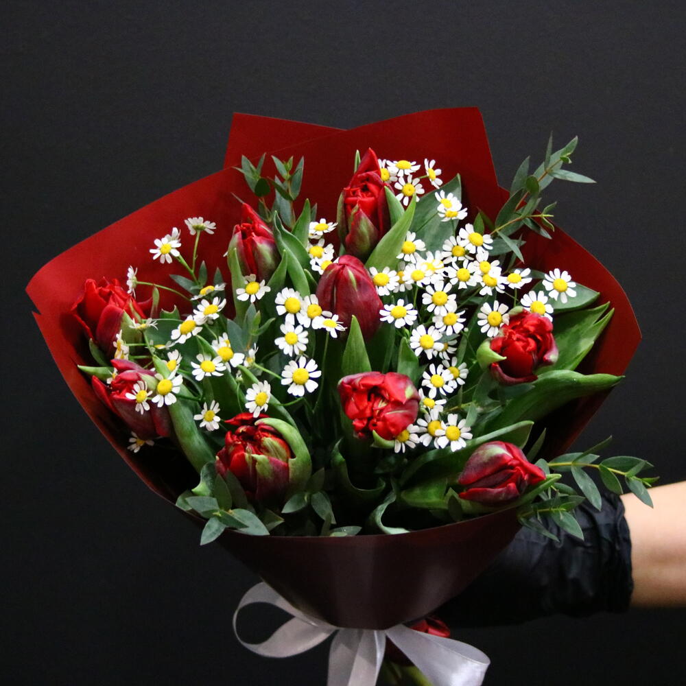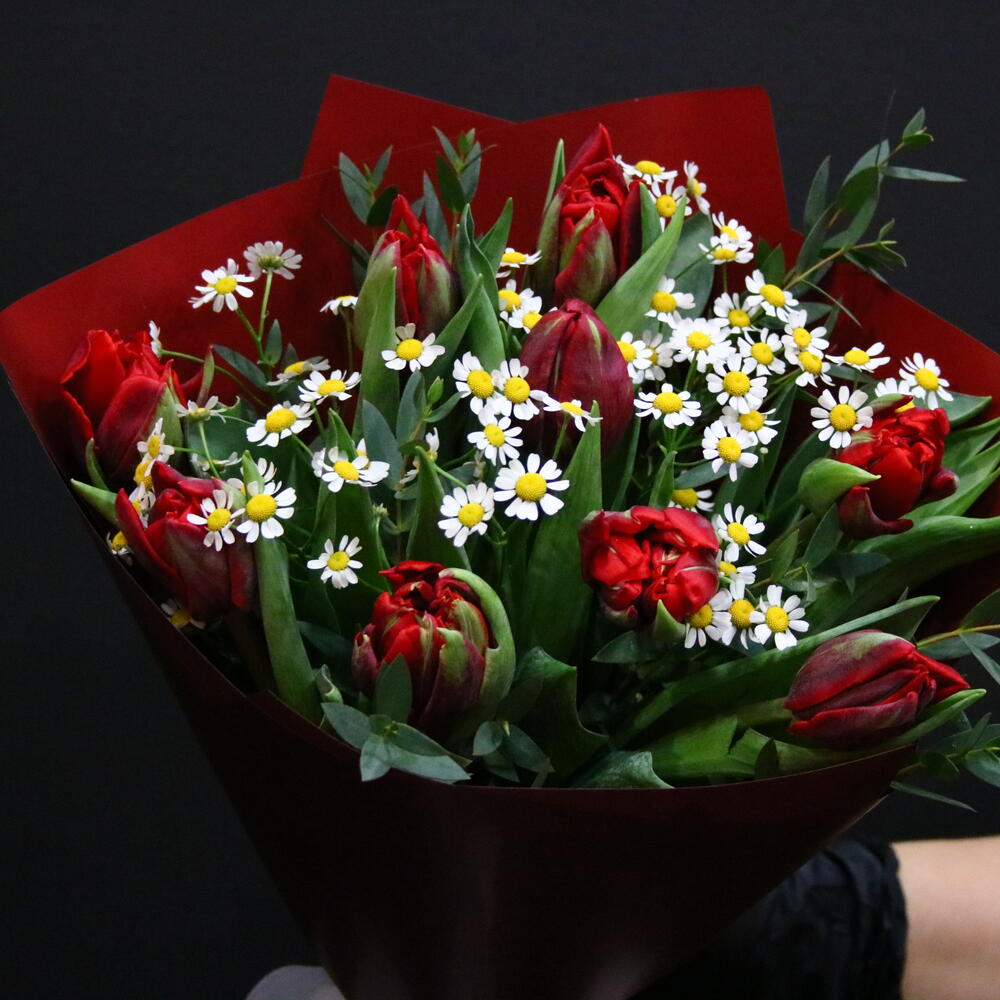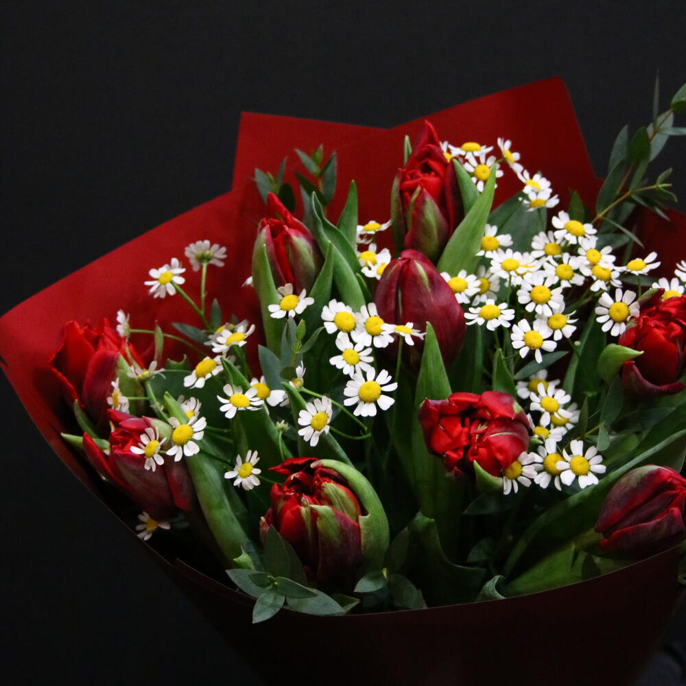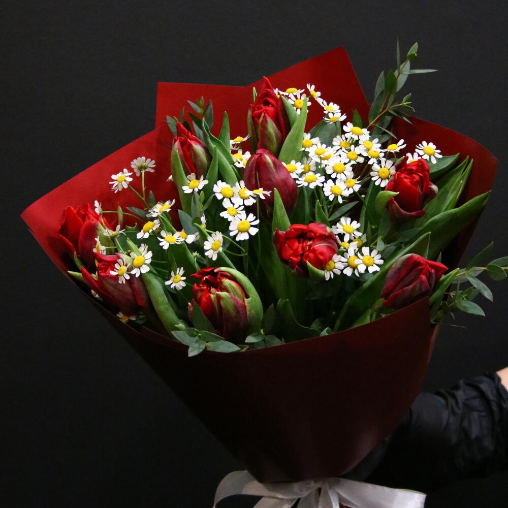 Eucalyptus - 2 pcs matricaria - 2 pcs peony tulips red princess - 9 pcs