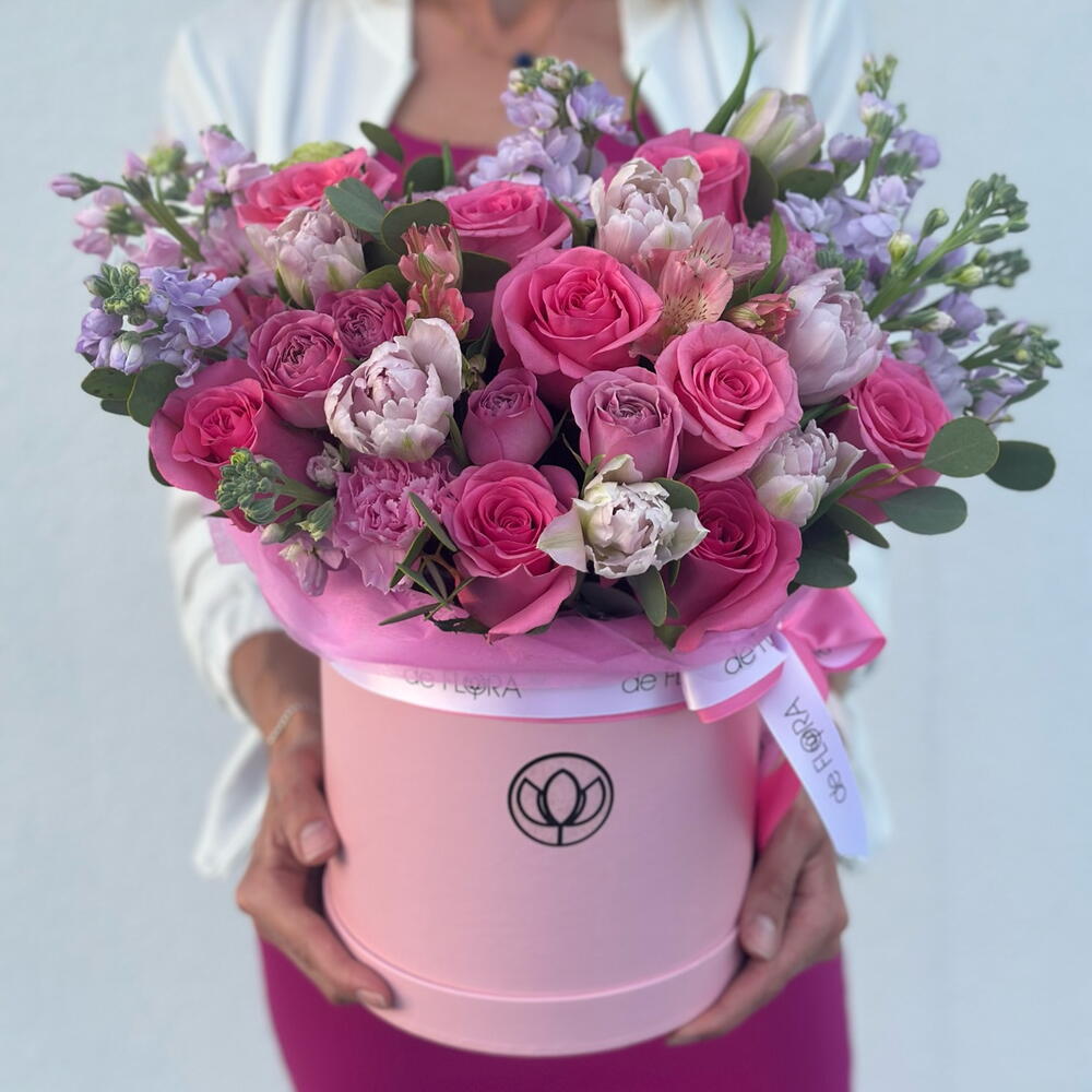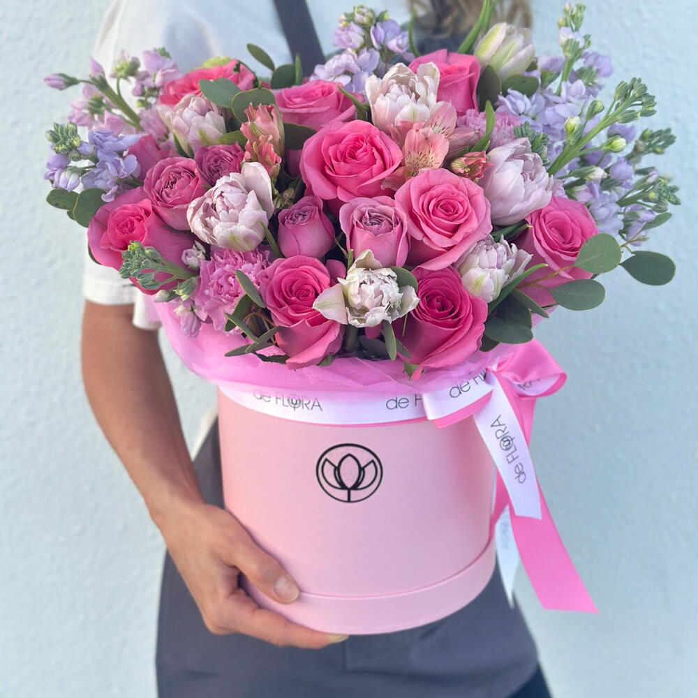 Eucalyptus - 7 pcs Tulips - 10 pcs carnation pink - 10 pcs alstroemerias - 5 pcs stock - 7 pcs roses - 15 pcs spray roses - 7 pcs