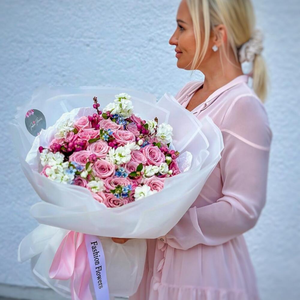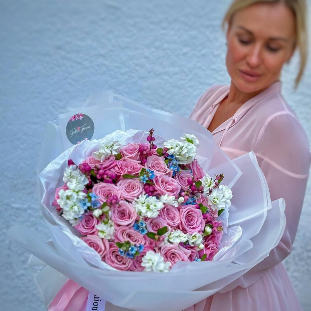 Matthiola - 10 pcs Rose - 25 pcs The language of the input text is Russian, and it translates to "Tweedie" in English. - 10 pcs berries - 10 pcs