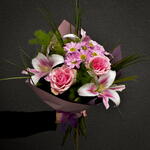 Greenery - 1 pcs Lily - 3 pcs rose - 3 pcs spray chrysanthemum - 1 pcs robelini palm leaf - 3 pcs