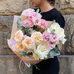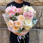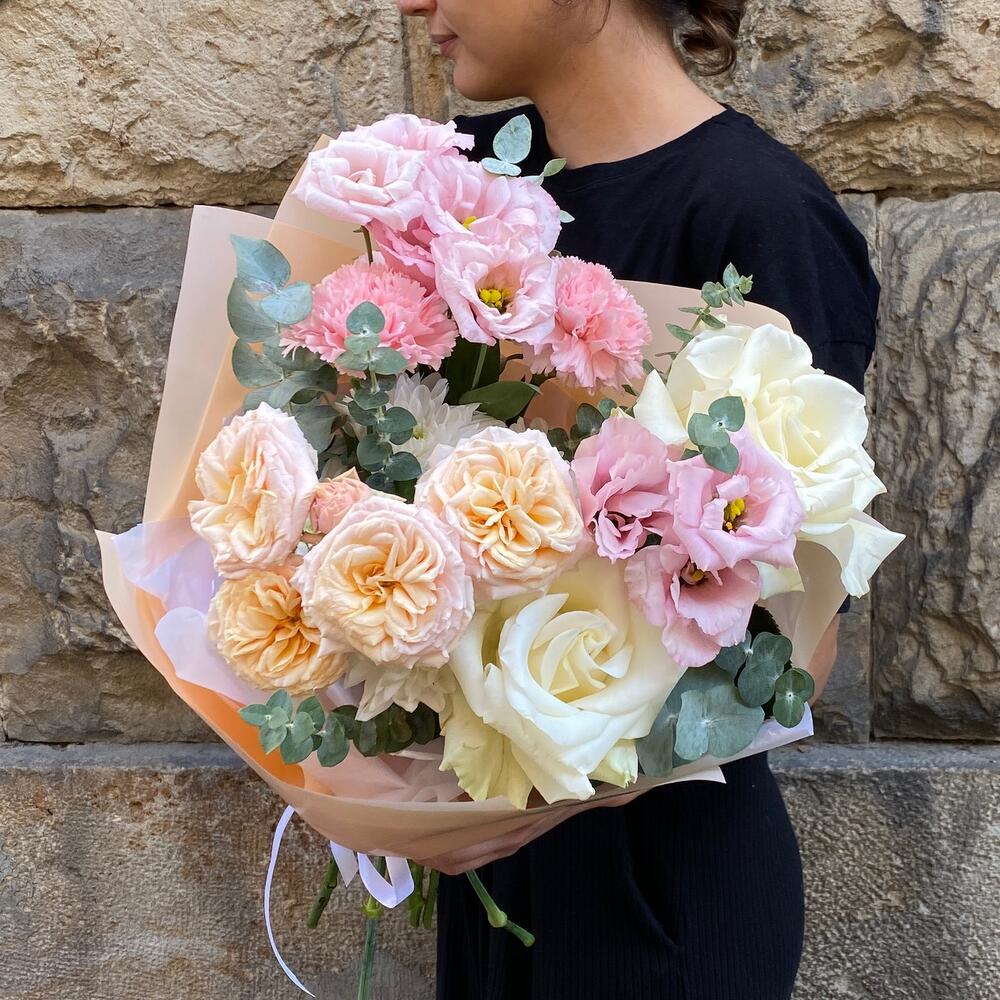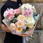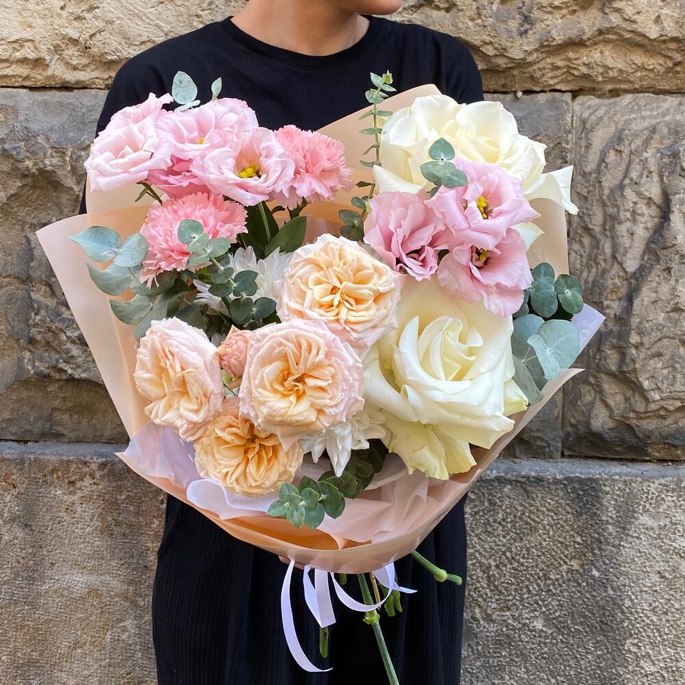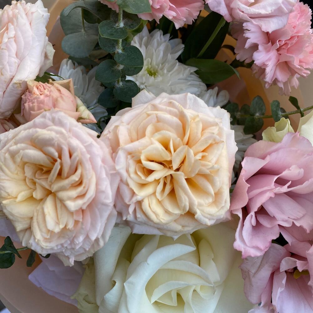 Ribbon - 1 pcs Eustoma - 2 pcs Eucalyptus - 1 pcs rose - 2 pcs packaging - 3 pcs dianthus - 2 pcs gentle trendsetter - 1 pcs chrysanthemum - 1 pcs
