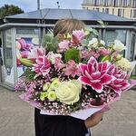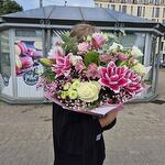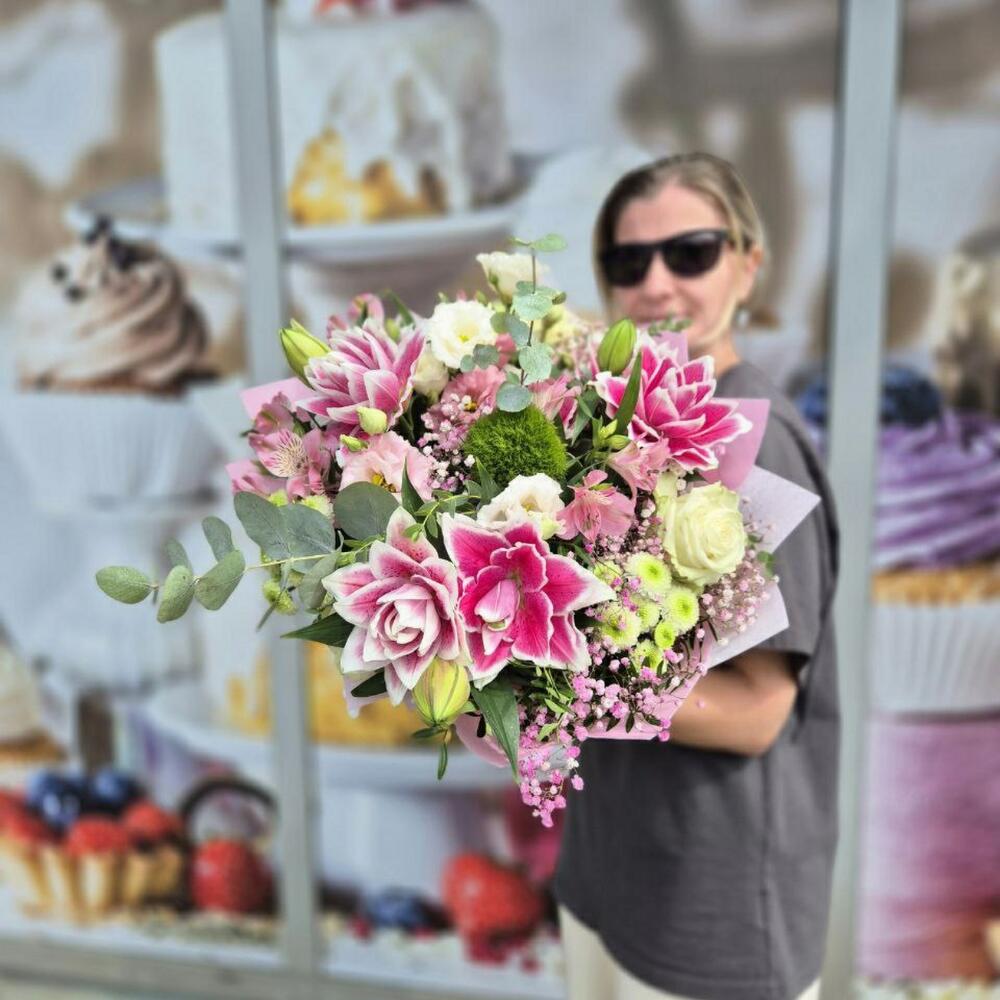 alstroemerias - 3 pcs green - 5 pcs white lisianthus - 3 pcs pink gypsophila - 3 pcs eucalyptus - 5 pcs roses - 3 pcs peony roses - 5 pcs lillia - 3 pcs