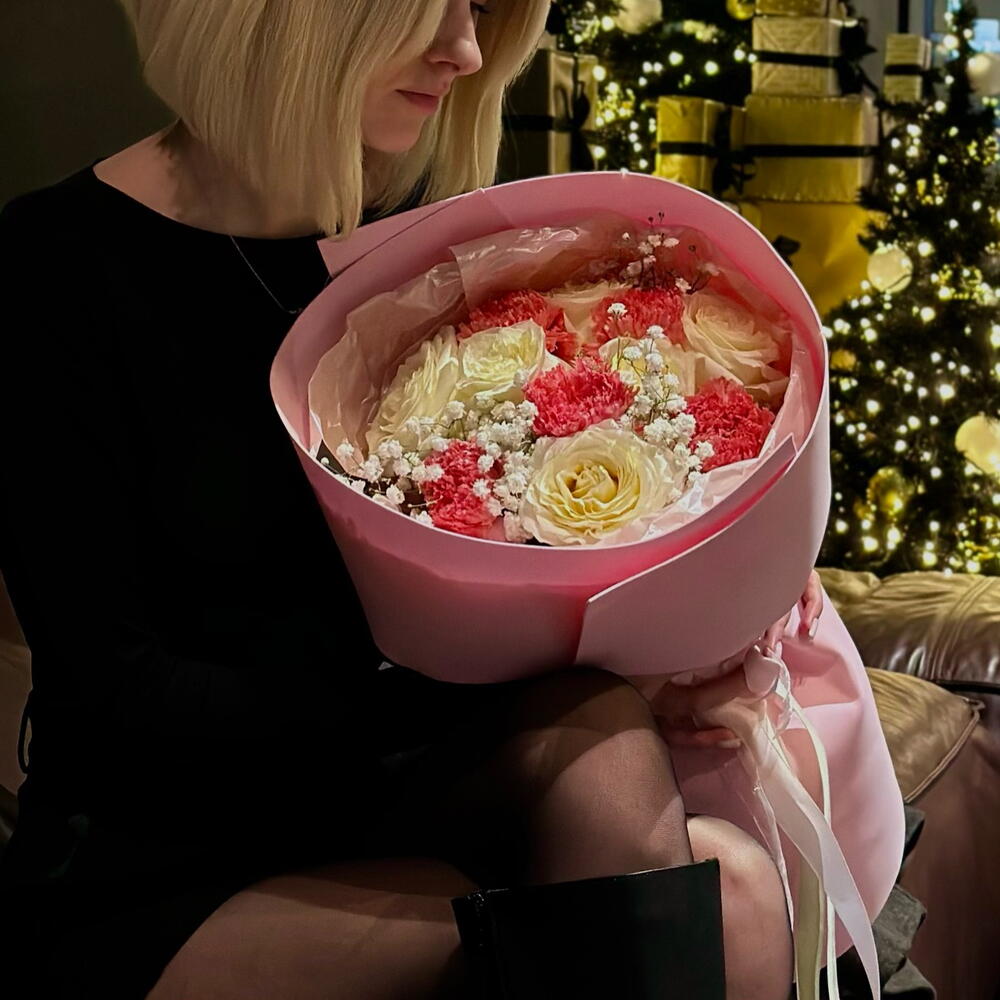A delicate bouquet in pastel colors, combining subtle roses, dianthus and baby's breath. Romantic, light and full of charm. 🌸✨