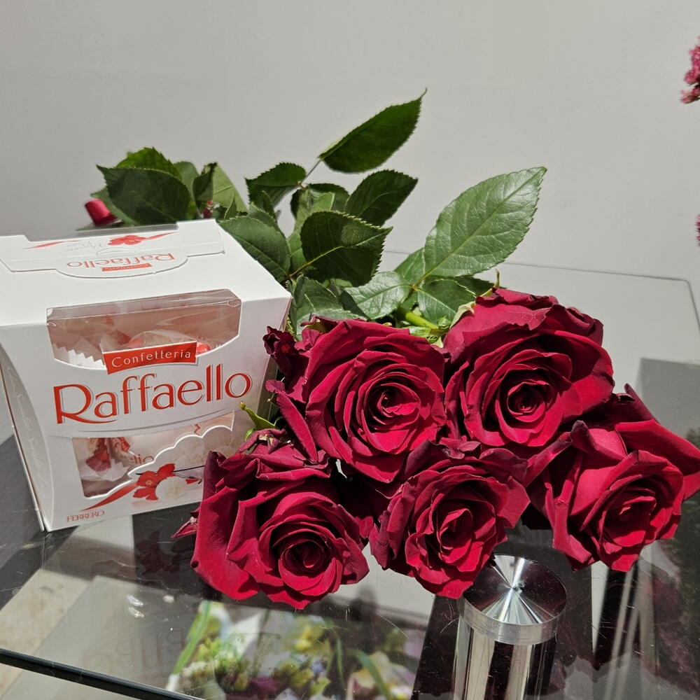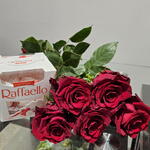 5 pcs. red roses 70cm tied with satin ribbon and Raffaello sweets 150g.