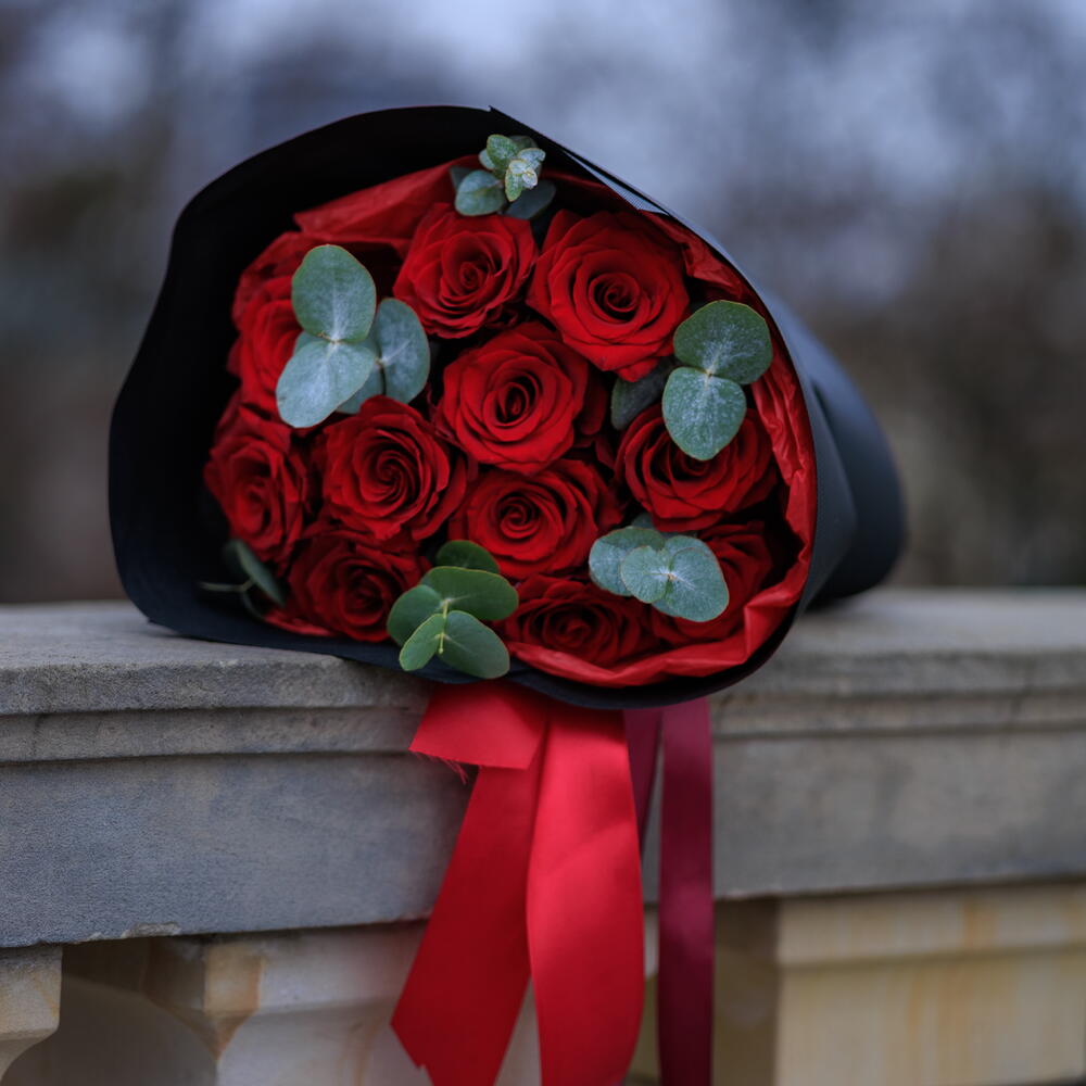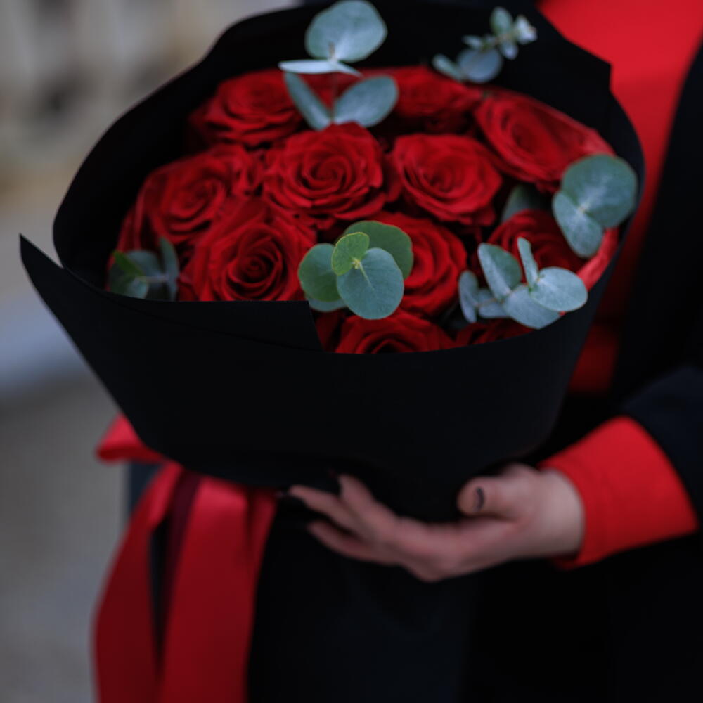 eucalyptus - 2 pcs red rose - 11 pcs floral packaging - 1 pcs