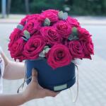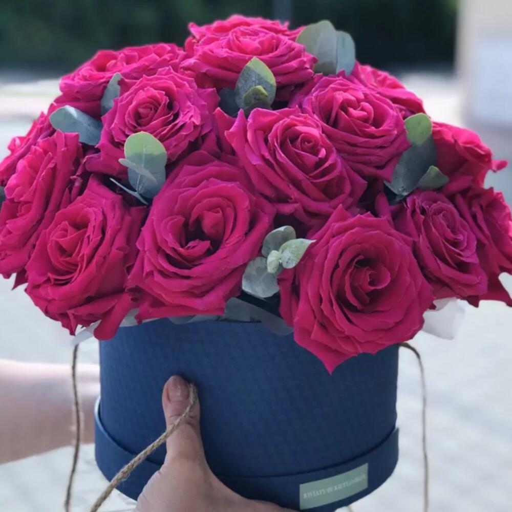 The price for an XL bouquet of 25-27 flowers is provided, but we make bouquets of various sizes from 9 to 50 flowers. Option to add a personalized note with a dedication for the recipient Composition: flower box, roses, eucalyptus, green fillers, ribbon