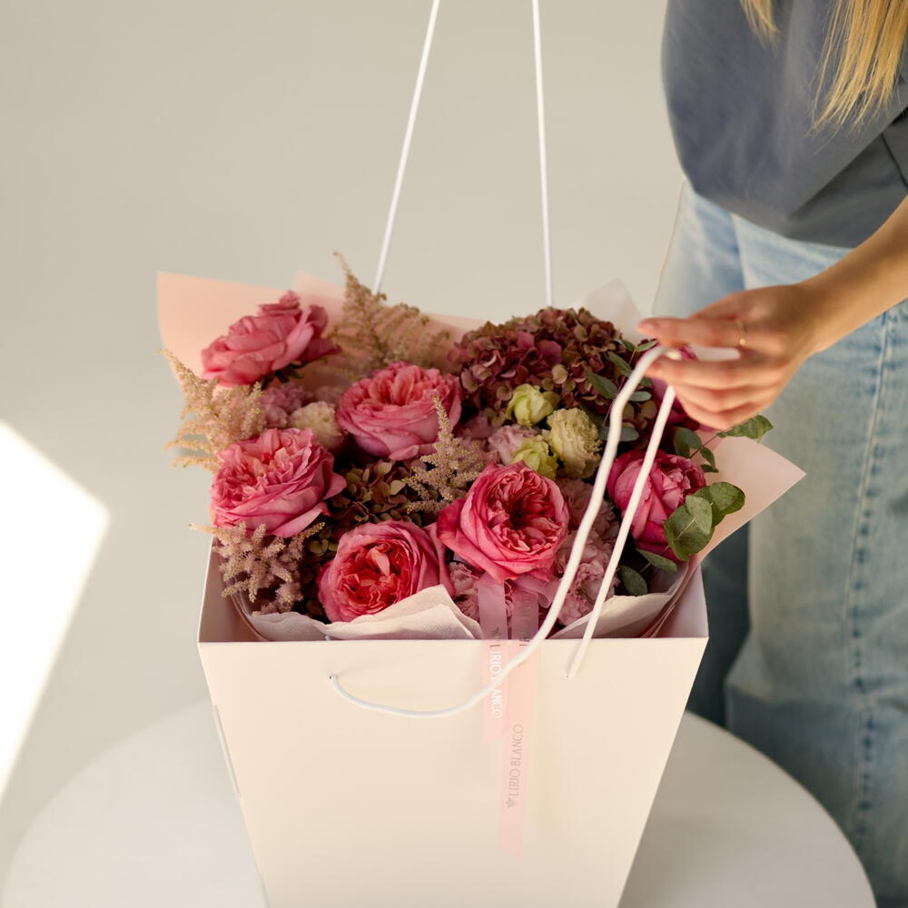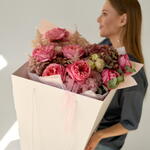 Hydrangea - 2 pcs astilbe - 5 pcs eustoma pink - 4 pcs eucalyptus - 3 pcs roses pink - 7 pcs