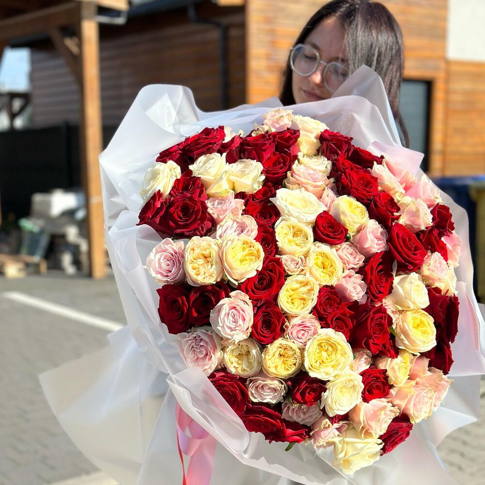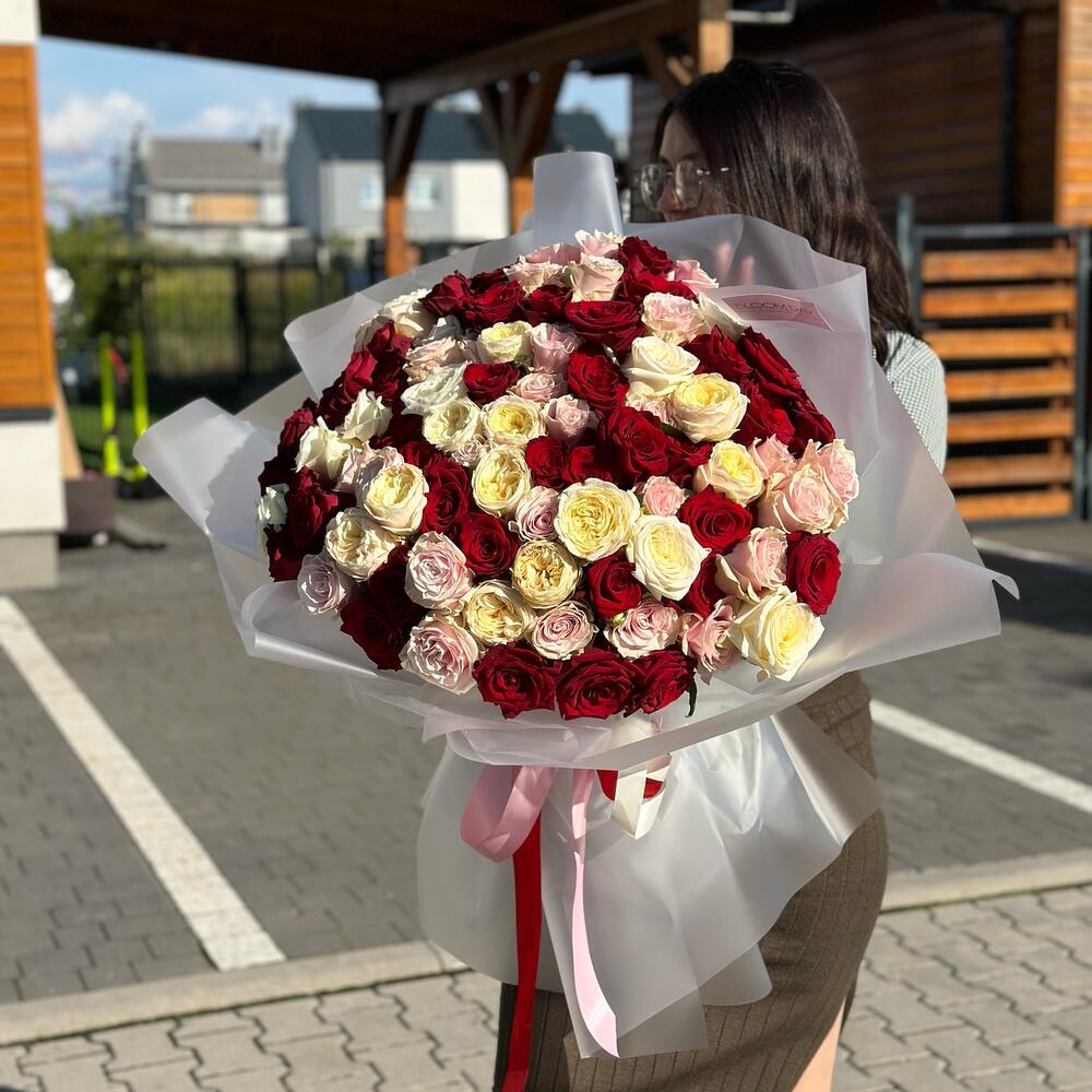 red rose - 35 pcs pink rose - 33 pcs paper packaging - 1 pcs white rose - 33 pcs