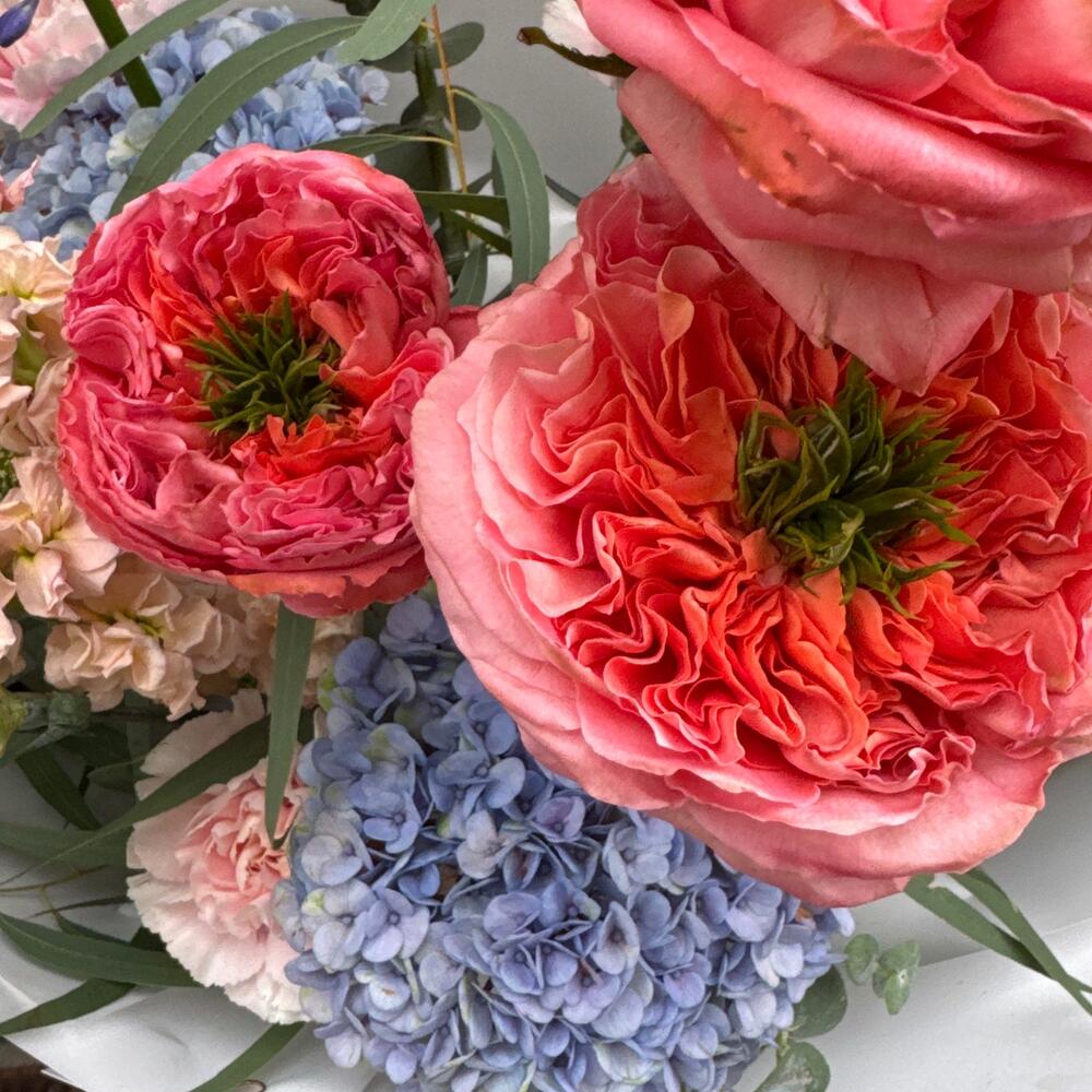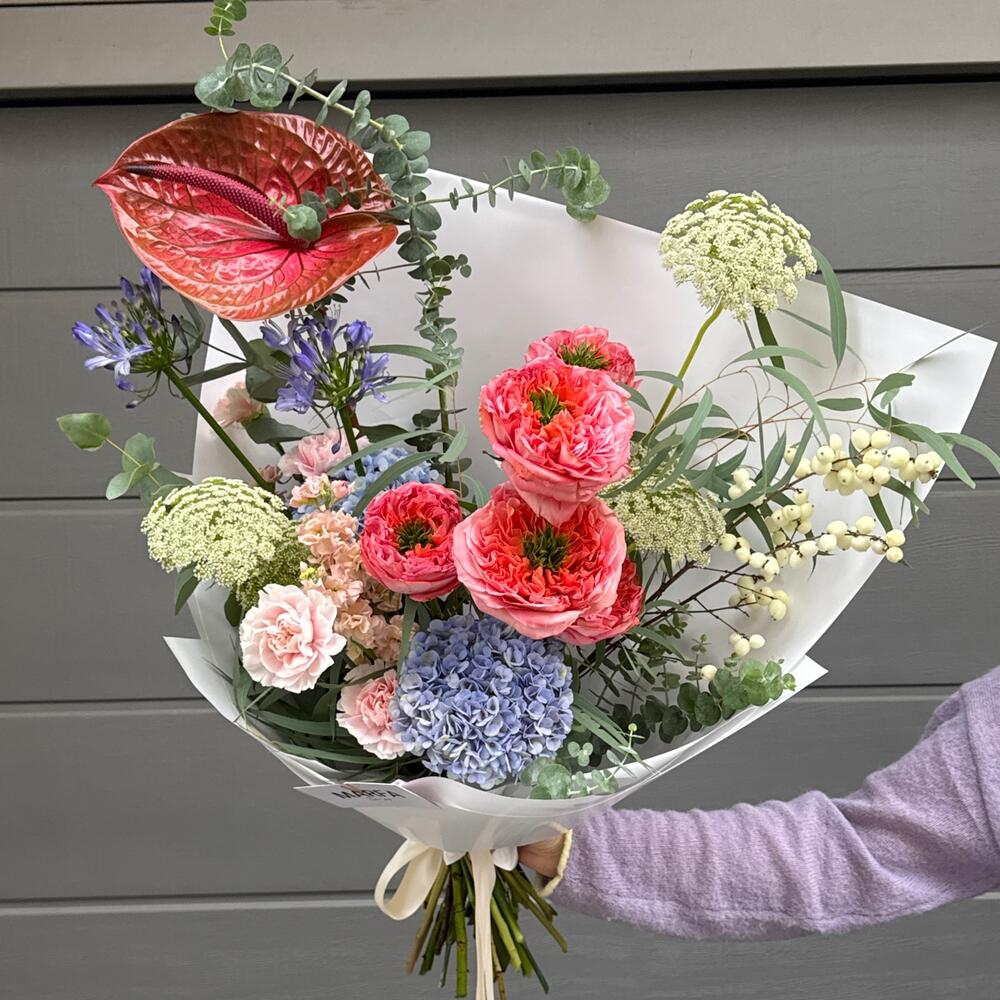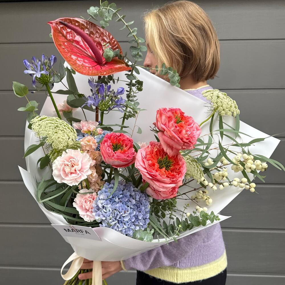 A large bouquet with a rich and interesting composition, available for fast delivery in Belgrade. Peony-style roses, exotic anthuriums, delicate hydrangeas, and other magnificent flowers make it a perfect gift.