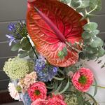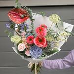 Eucalyptus - 5 pcs hydrangea - 2 pcs Anthurium - 1 pcs rose - 5 pcs dianthus - 5 pcs matthiola - 3 pcs mom - 4 pcs onigosanthus - 2 pcs simphoricarpus - 2 pcs