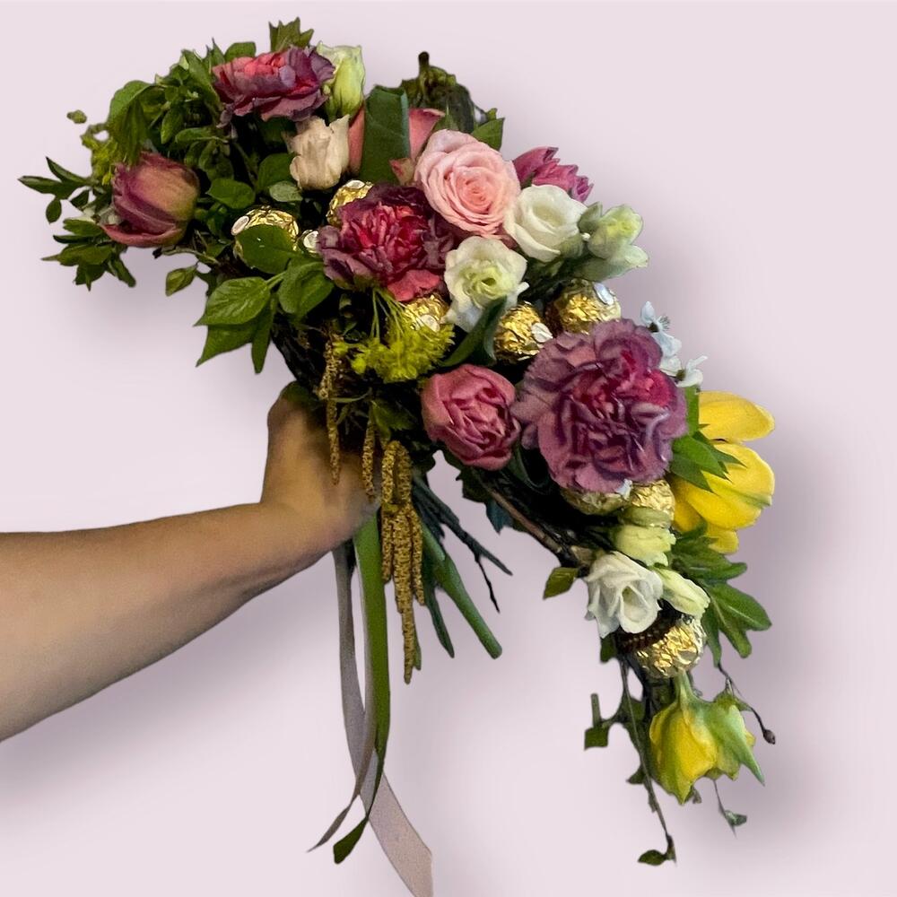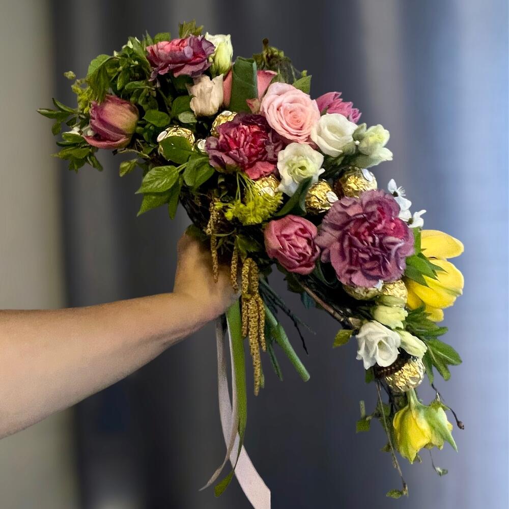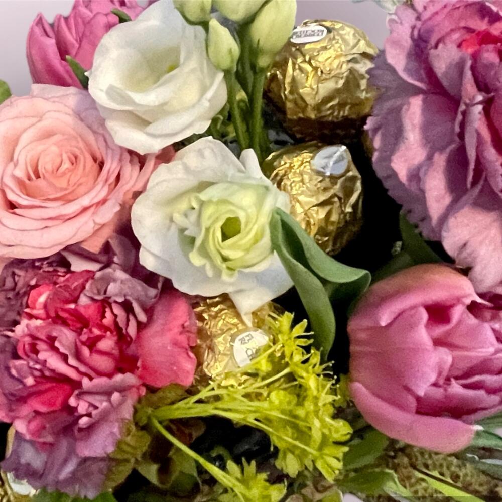 Eustoma - 2 pcs Ferrero rocher - 200 g carnations - 3 pcs tulips mixed - 7 pcs roses - 3 pcs the boat frame - 1 pcs