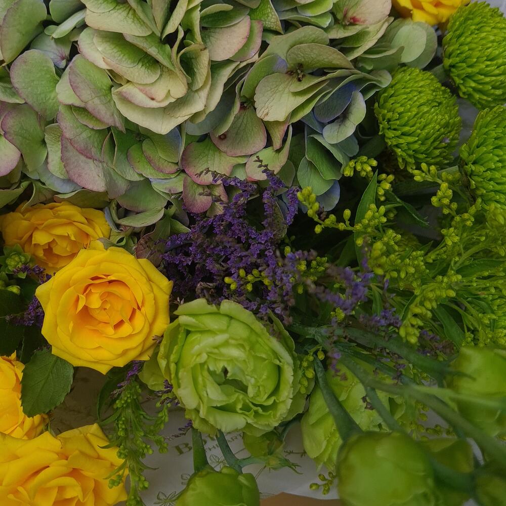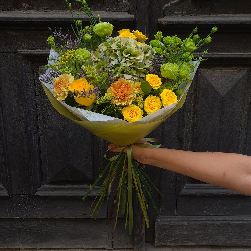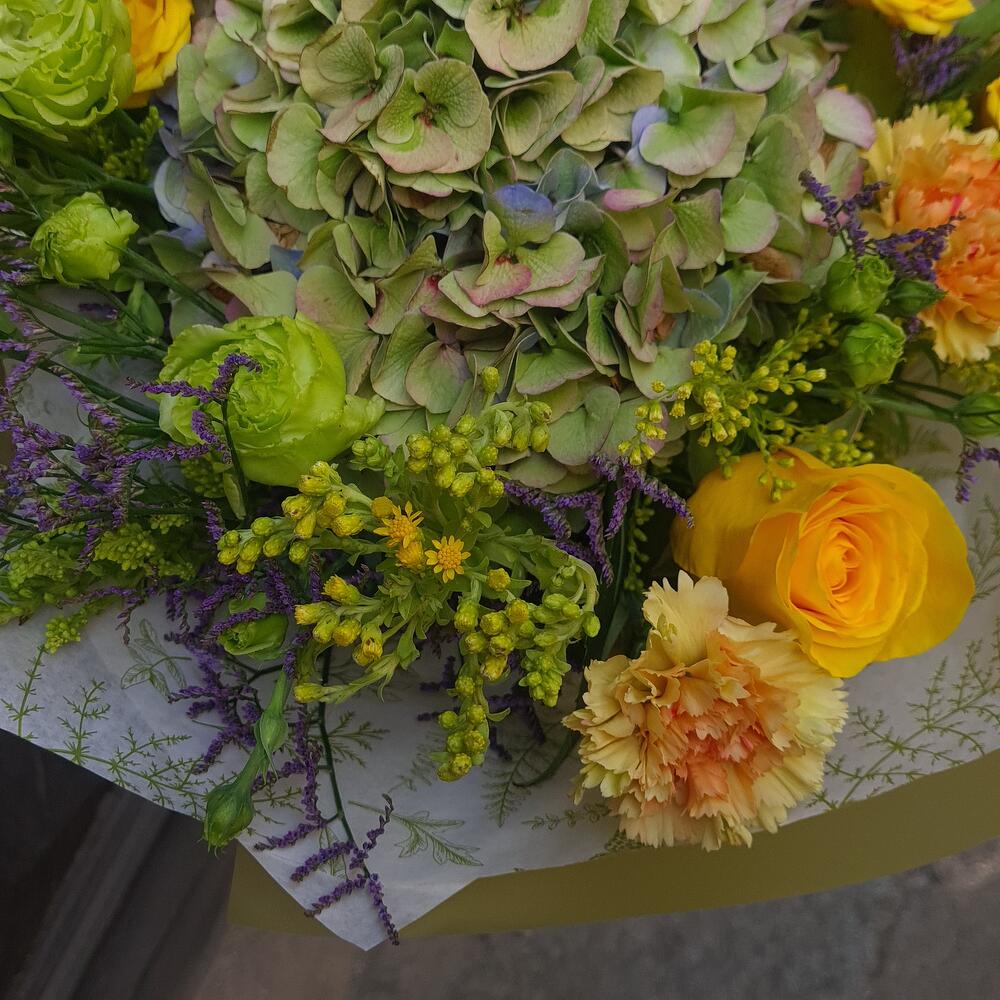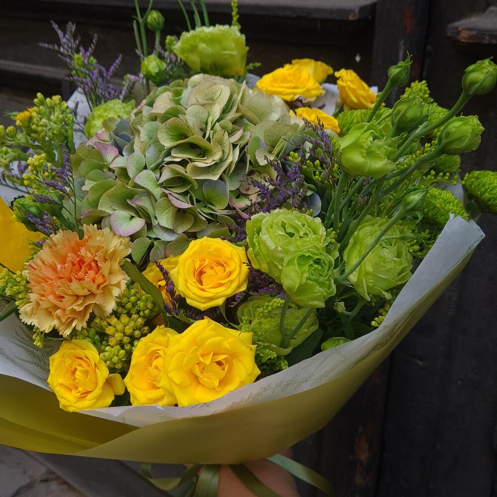 A bouquet that carries pure sunshine and freshness. Sunlight Whisper is a delicate mix of lush hydrangea, radiant yellow roses, bright chrysanthemums, green lisianthus, and seasonal wild accents. Cheerful and elegant, it’s perfect for birthdays, celebrations, thank you gifts, or simply to brighten someone’s day. Crafted from fresh-cut flowers, this bouquet brings a natural harmony of colors—yellow, green, and soft orange—wrapped in a modern Botanika style. A gift full of warmth, joy, and light. Same day delivery in Belgrade.