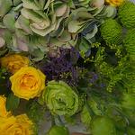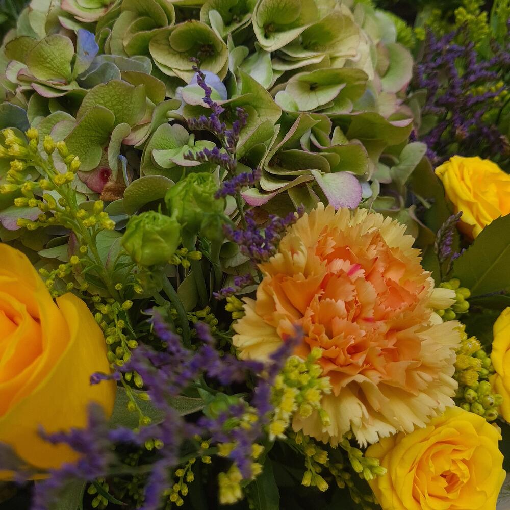 Eustoma - 2 pcs Hydrangea - 1 pcs Limonium - 2 pcs Chrysanthemum - 1 pcs Solidago - 5 pcs Decoration - 1 pcs dianthus - 2 pcs rose ecuador - 1 pcs roses mini - 2 pcs
