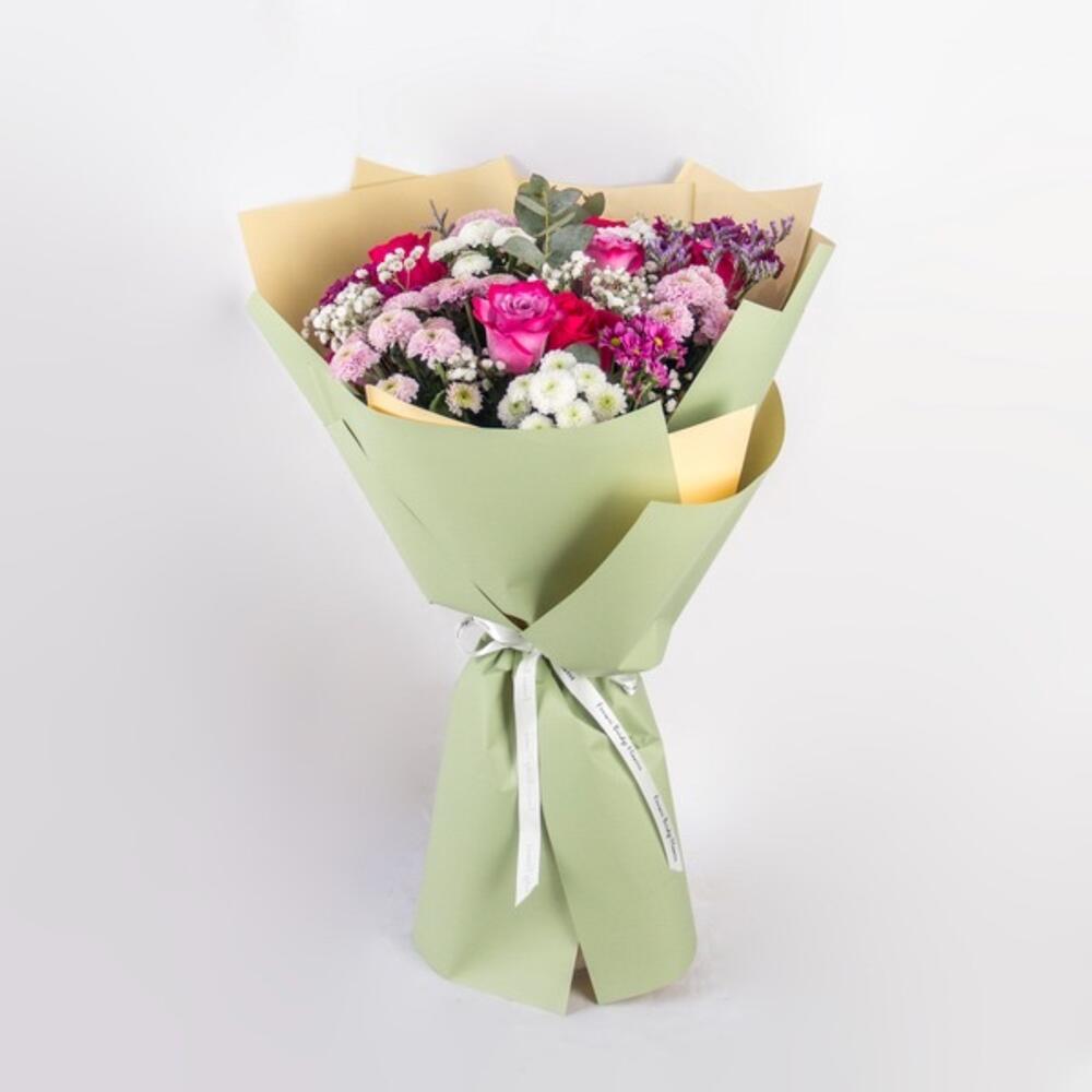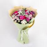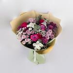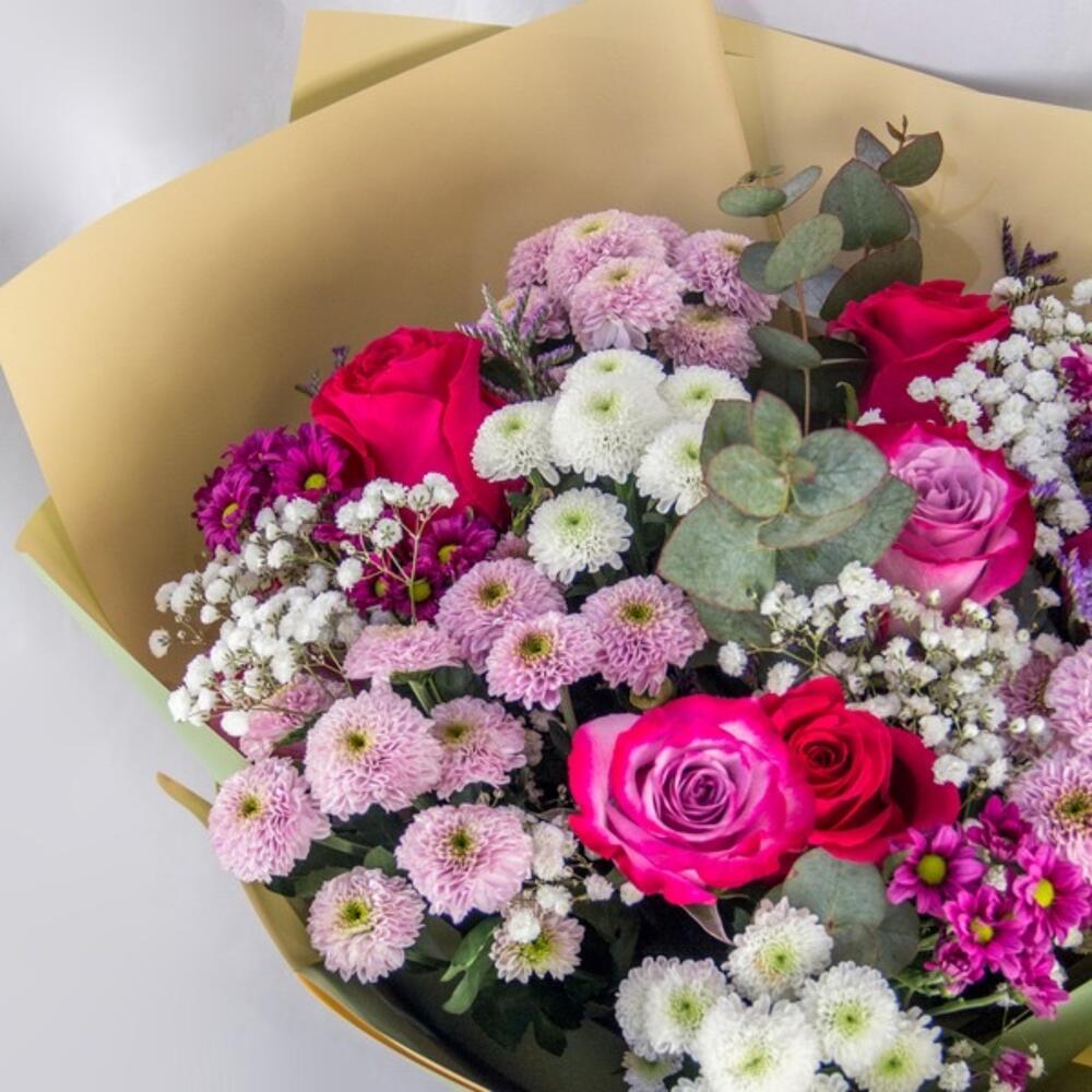 This stunning bouquet features a lush mix of romantic roses and delicate spray chrysanthemums in shades of pink, purple, and white.