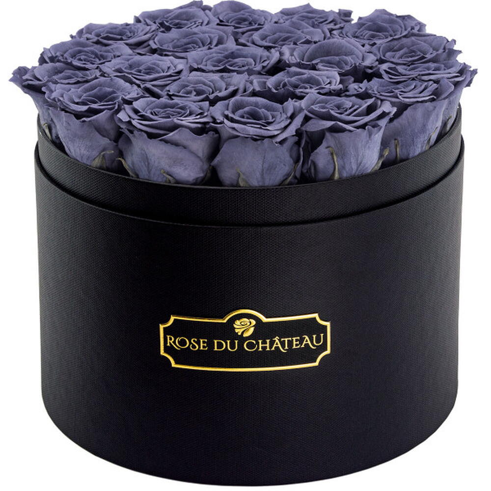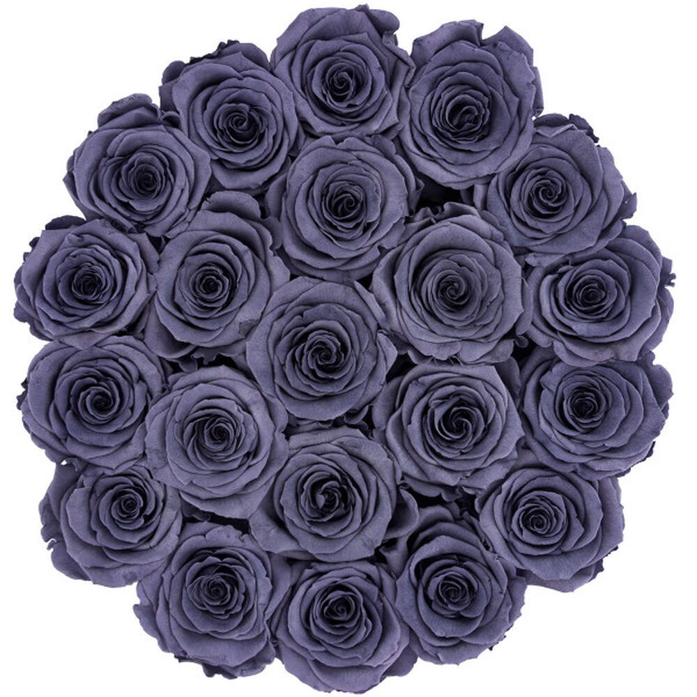 Modern Grey Are you a fan of elegant gifts, and are ordinary flowers not refined enough? We recommend eternal roses—real flowers that retain their color and shape for at least 2 years. Gray roses in a black flower box will be an unforgettable surprise. You can be sure that this stylish set will dazzle for much longer than a traditional bouquet. The gray color of the flowers and the black box make a great combination for people with a sophisticated style, and also as a gift for men. They also blend well with modern interior decor. They will certainly be an unusual and rarely seen gift. In addition, flowers placed in such a large box will undoubtedly not go unnoticed. Gray roses are modern and timeless. They are perfect as decoration for fashionable interiors, and also as a gift for a man. They will certainly be an unusual and rarely seen gift. Number of roses: The box holds approximately 21 roses Box diameter: Ø 25 cm We use one of the best varieties of eternal roses available worldwide.