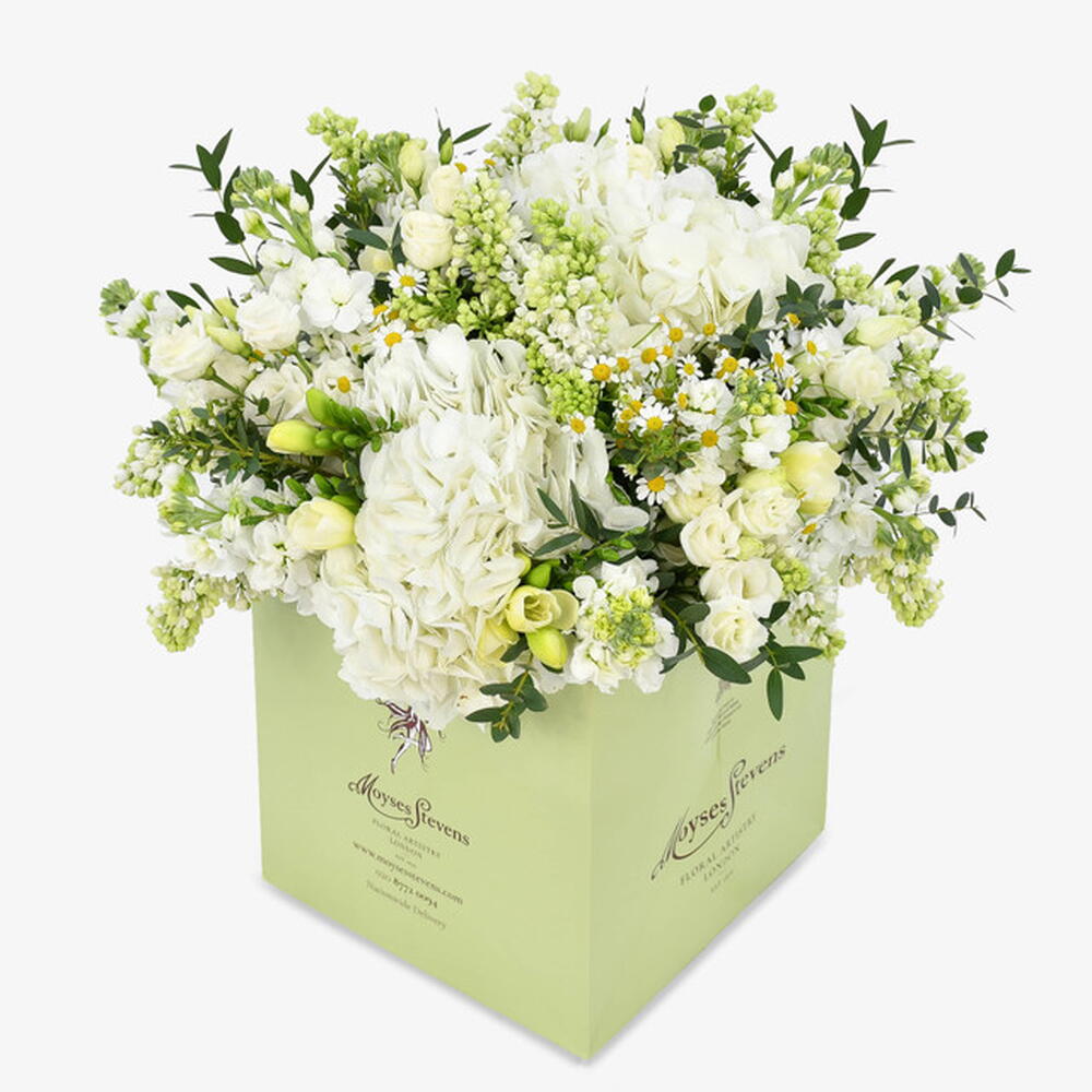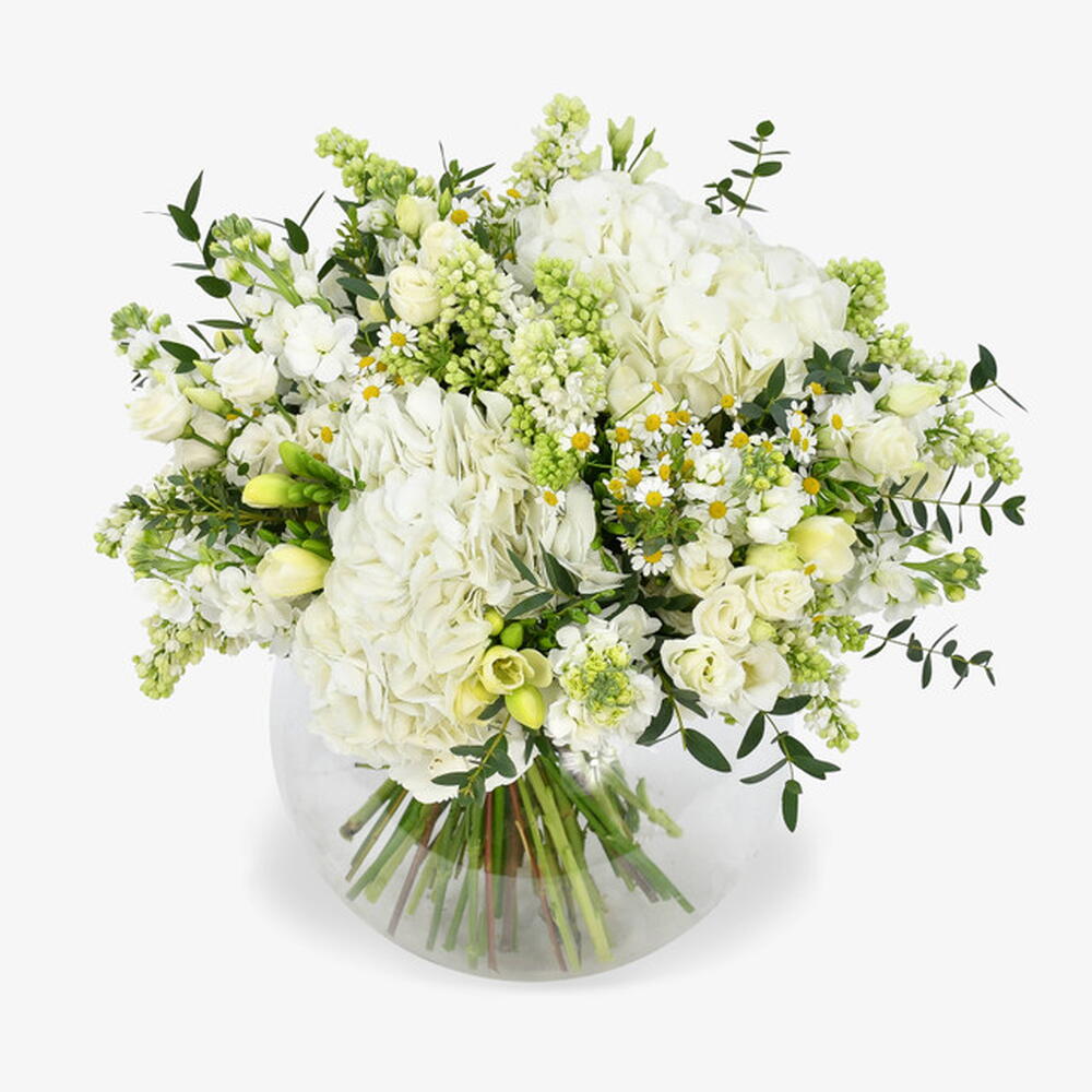Effortless elegance abounds in this subtle yet striking bouquet of hydrangeas, daisies, eucalyptus and delphinium. Flashes of verdant green provide the backdrop for the flamboyance and fluffy exuberance of our hydrangeas, while sprigs of eucalyptus transport us to a distinctly Grecian world.
