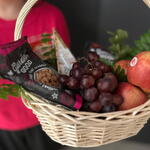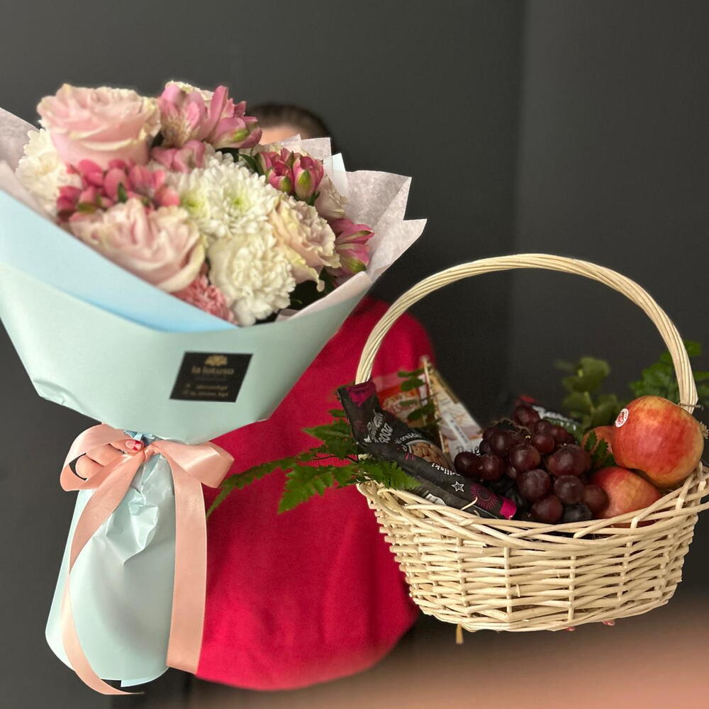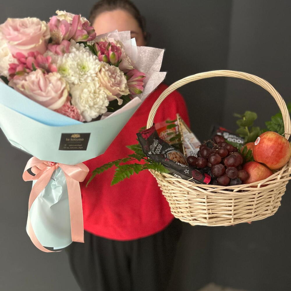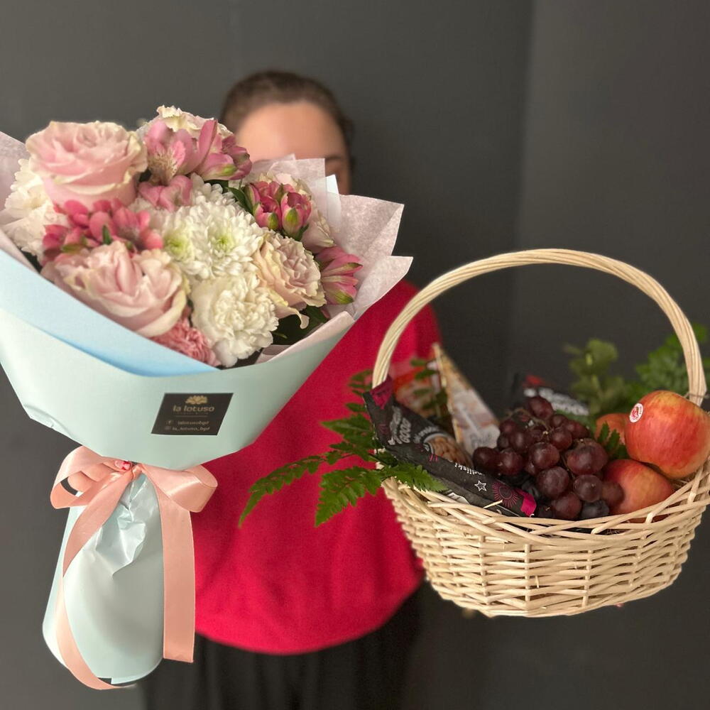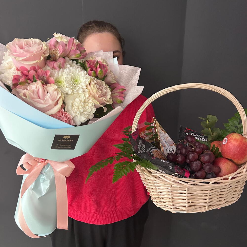 The package includes: A bouquet of fresh flowers A surprise basket made up of fresh fruit, stone fruit and the best cheese Note: The design of the bouquet can be change to a similar one if the required materials is not available