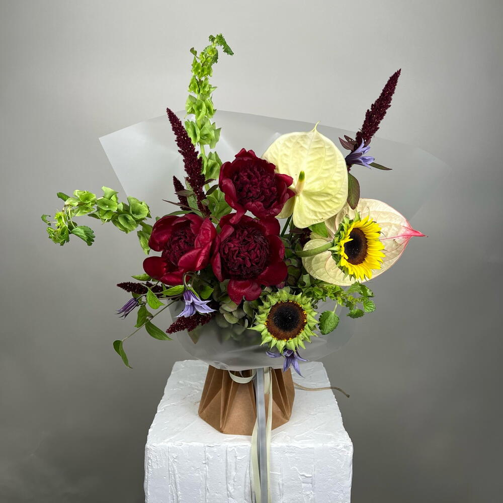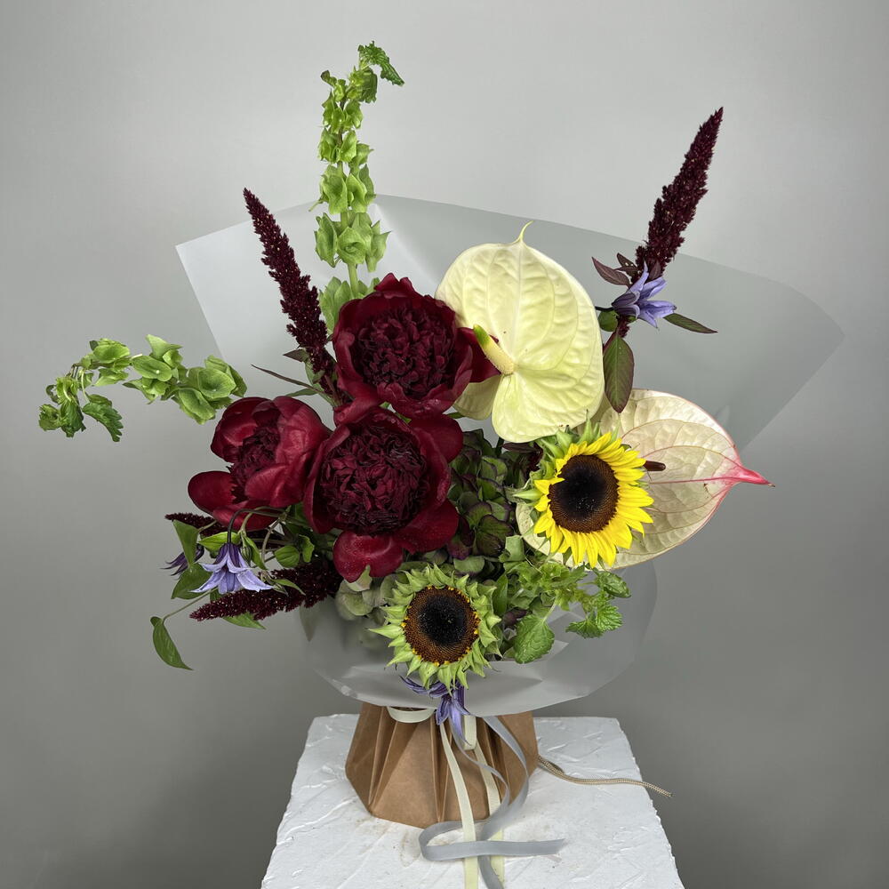 Anthurium - 2 pcs Peonies - 3 pcs amaranthus - 5 pcs clematis - 3 pcs irish bells - 4 pcs dutch hydrengea - 1 pcs