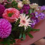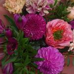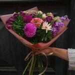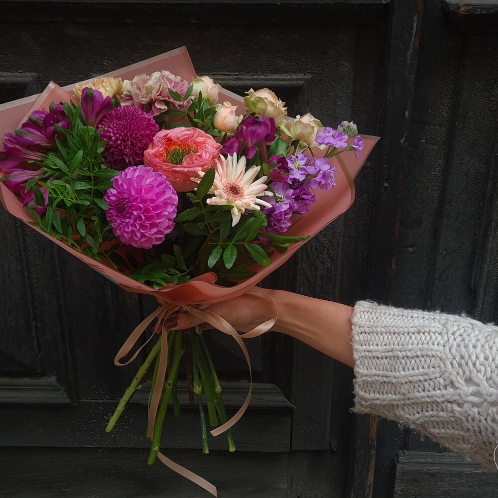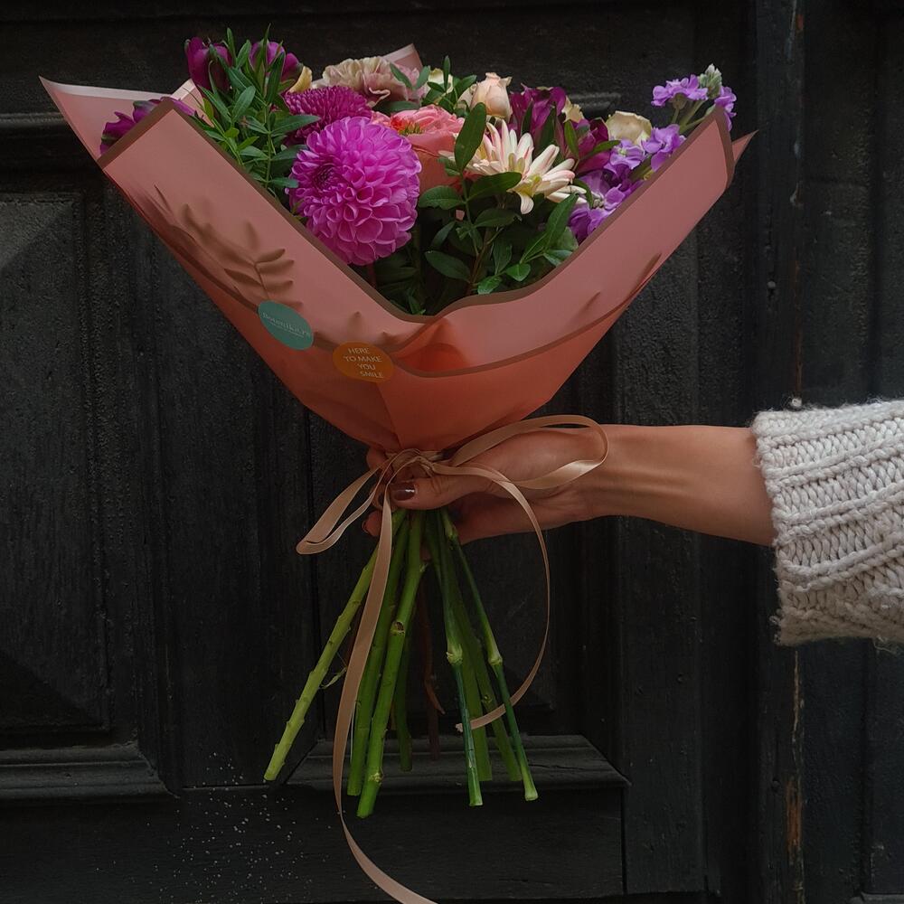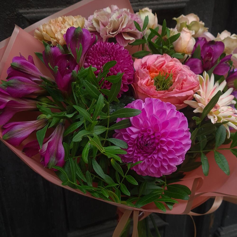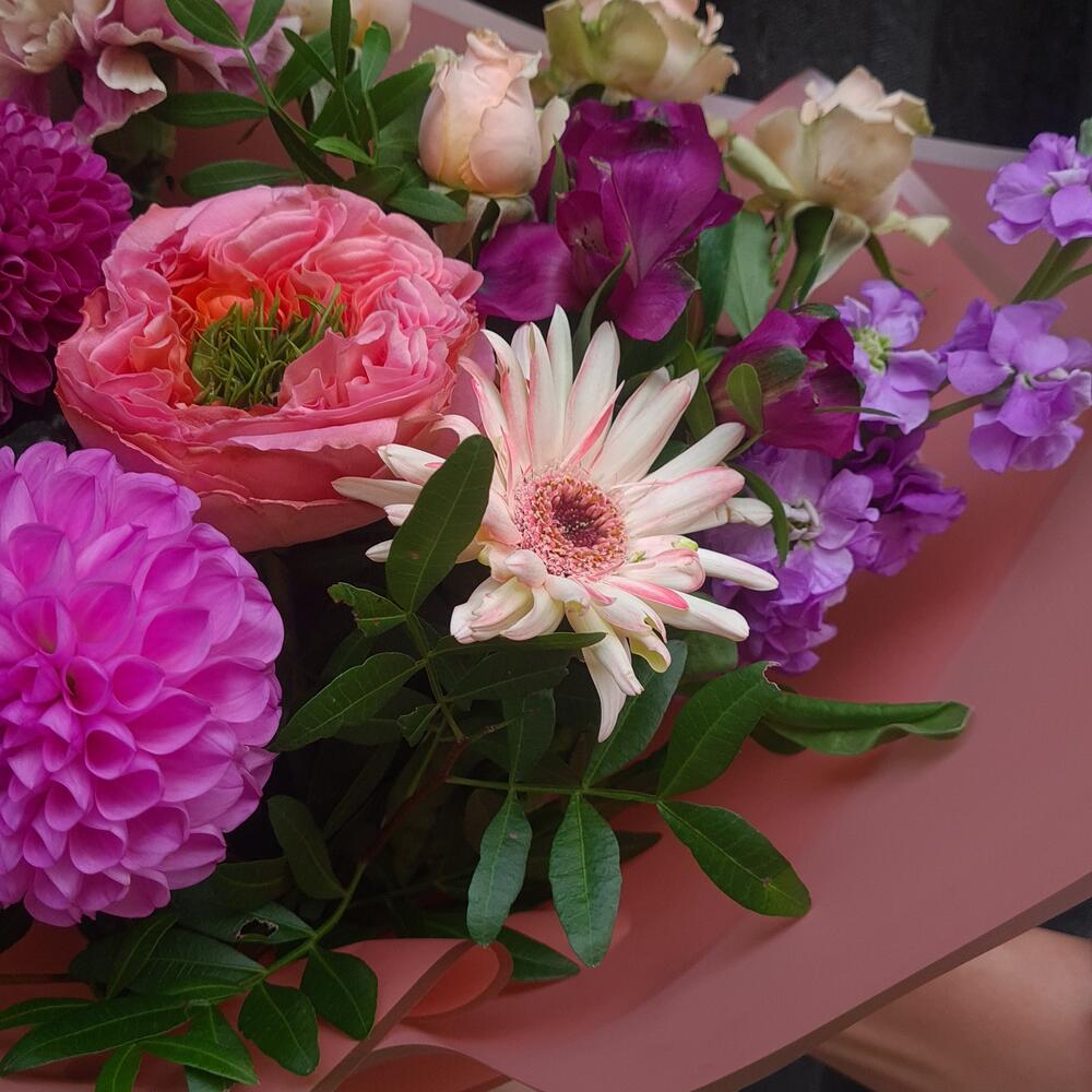Greenery - 1 pcs Chrysanthemum - 1 pcs Alstroemeria - 2 pcs Mini rose - 1 pcs dianthus - 2 pcs matthiola - 1 pcs dahlia - 1 pcs gerber - 1 pcs roses - 1 pcs decoration wrapping - 1 pcs