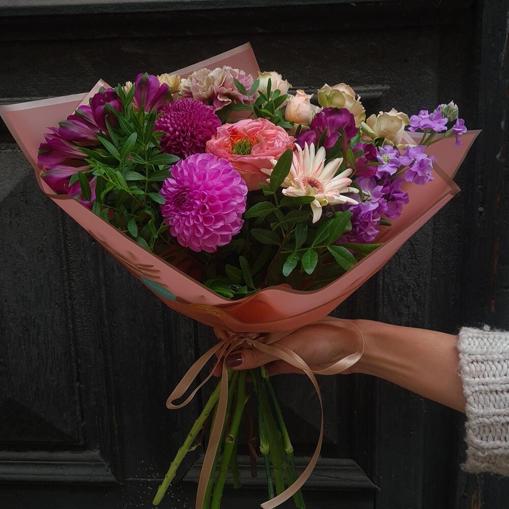 🌿 Velvet Symphony “Velvet Symphony” is an elegant bouquet composed like a piece of art — where warm and cool tones meet in perfect harmony. Cream gerbera, lilac dahlia, peach English rose, raspberry freesia, deep red rose, burgundy dianthus, violet chrysanthemum, salmon chrysanthemum, and purple alstroemeria create a lush, textured composition full of depth and emotion. Perfect for birthdays, anniversaries, celebrations, or as a luxurious gift to someone special. Each bloom is hand-selected and arranged with care in Botanika’s signature natural style — elegant, fresh, and full of life.