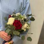 Brunia - 2 pcs Satin ribbon - 1 pcs Eucalyptus - 2 pcs Lisianthus - 2 pcs rose - 5 pcs mix greenery - 1 pcs