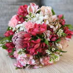 Lisianthus - 1 pcs Wax flower - 2 pcs rose - 3 pcs carnation - 3 pcs gipsofila - 3 pcs protea - 1 pcs mix alstroemerias - 10 pcs